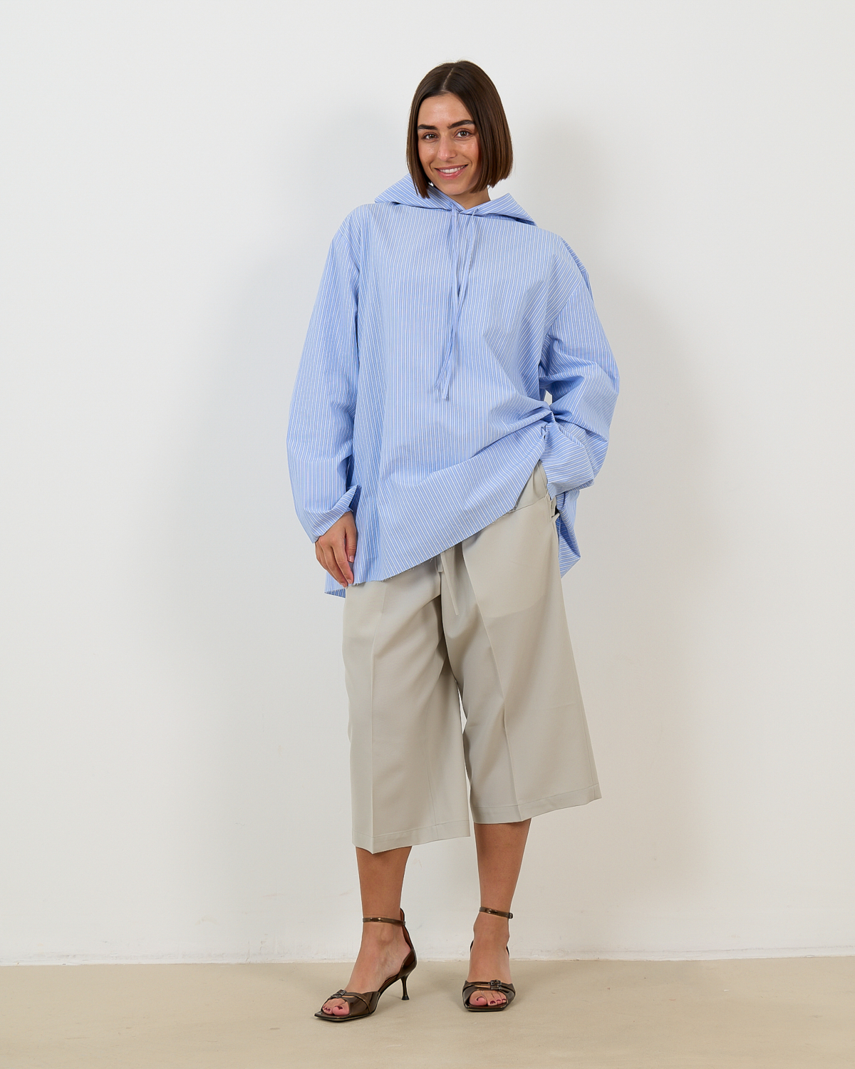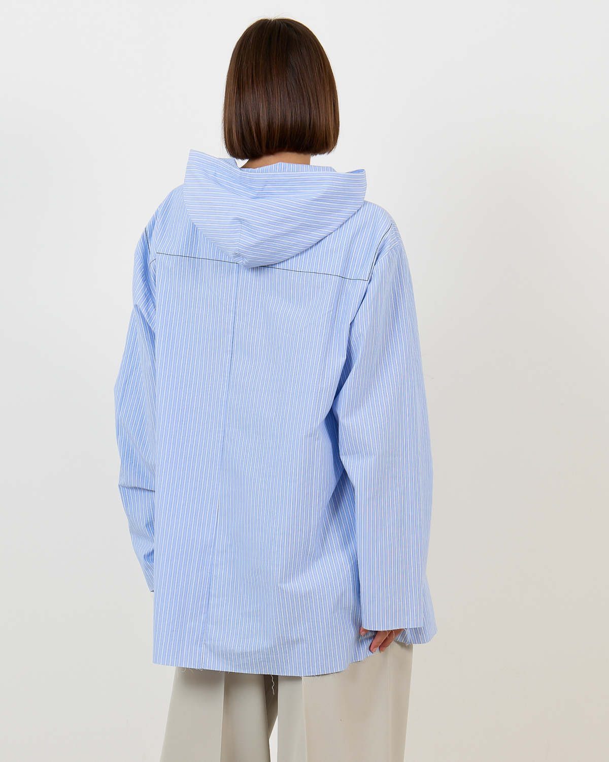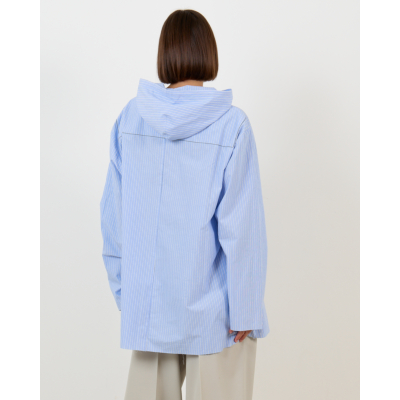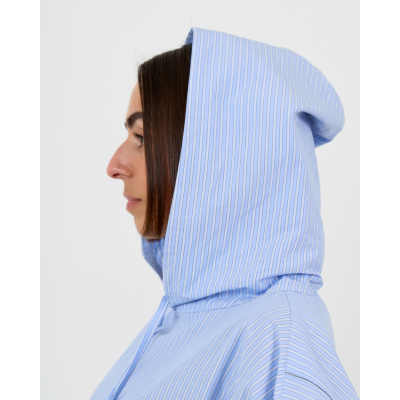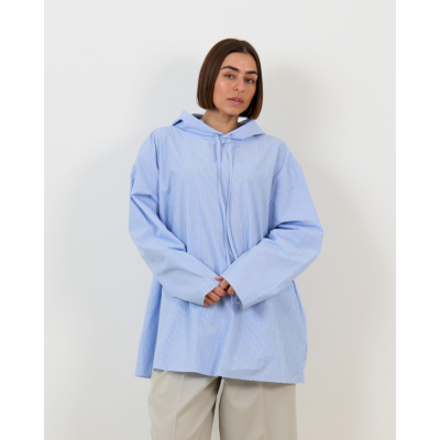 This blue striped hooded blouse from 6397 redefines casual sophistication in women's clothing. The fine pinstripe pattern in fresh blue tones creates an elegant backdrop, while the oversized fit delivers contemporary comfort. Crafted from 100% cotton, this long-sleeved piece features a drawstring hood and relaxed silhouette that extends beyond the hips. The quality construction ensures both durability and breathability for all-day wear.