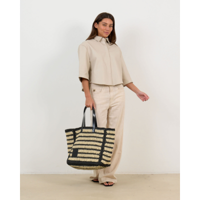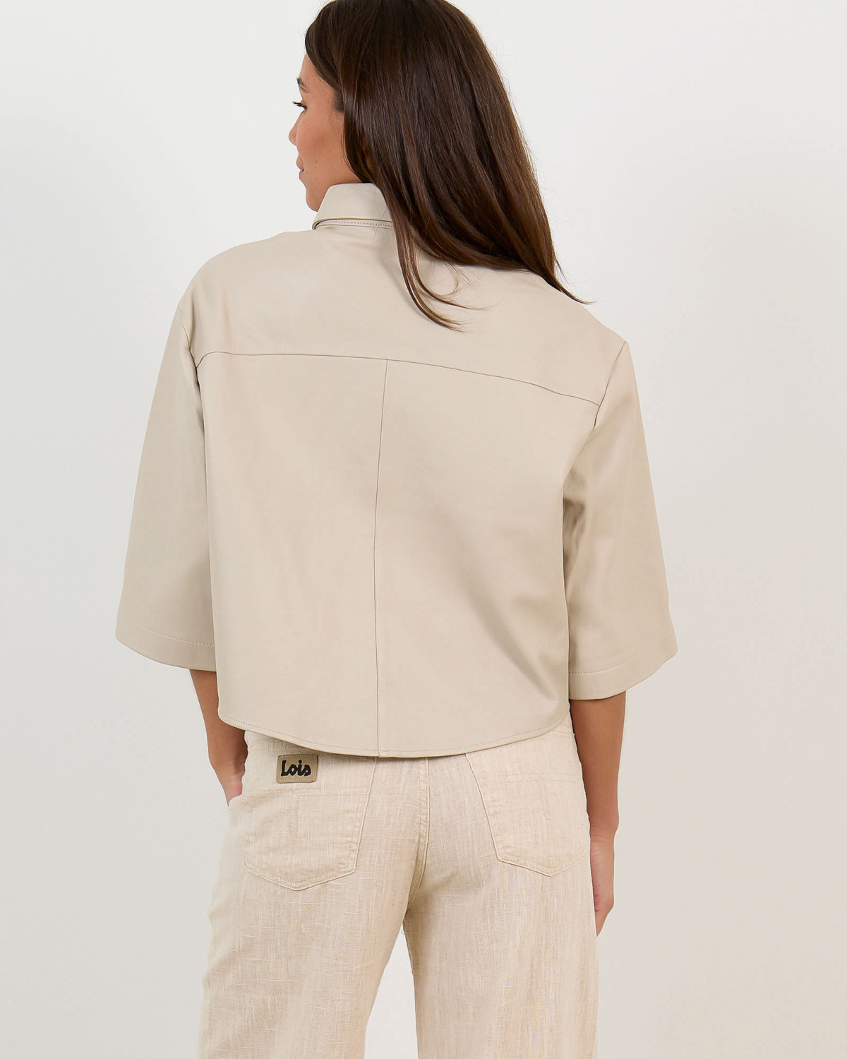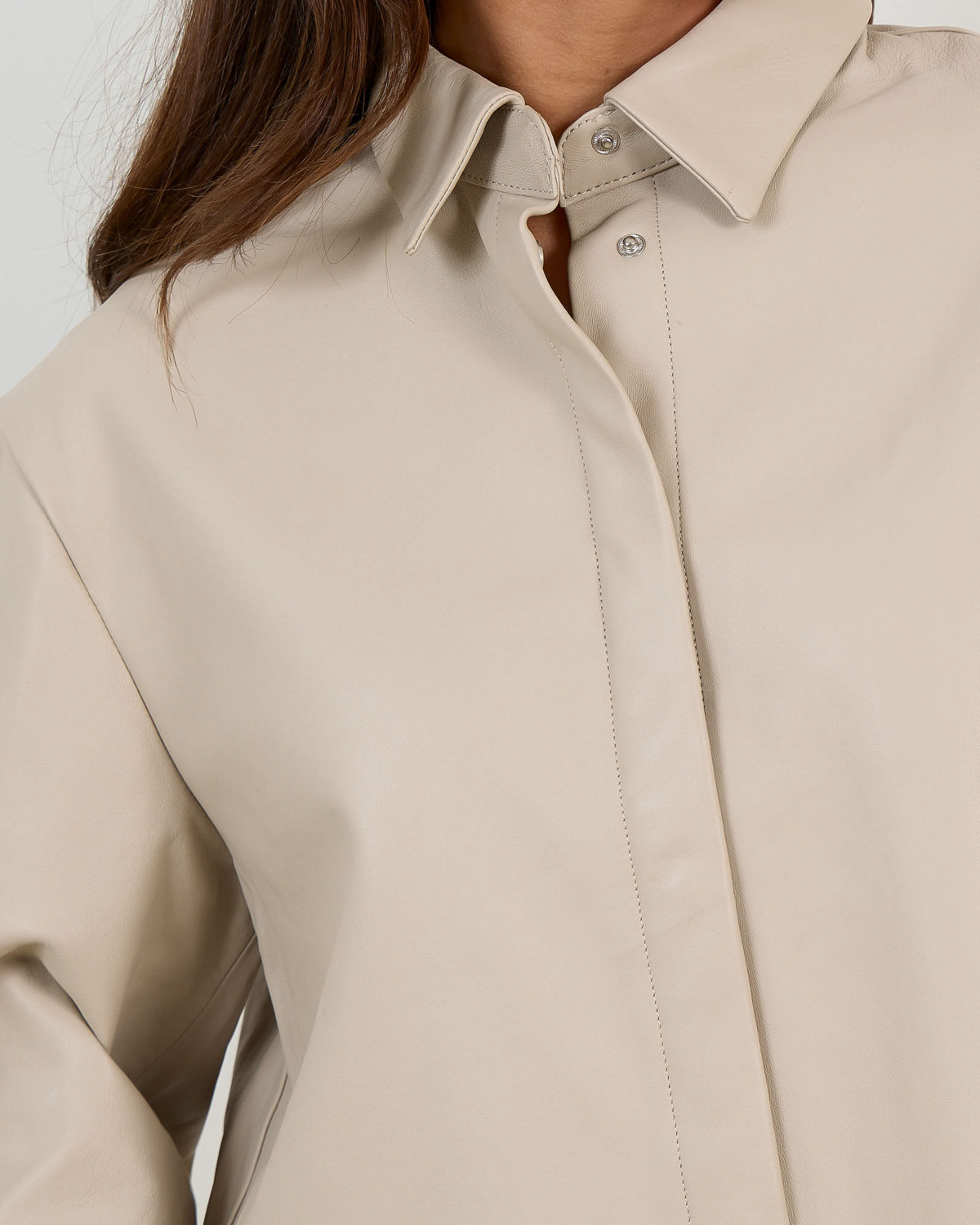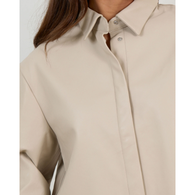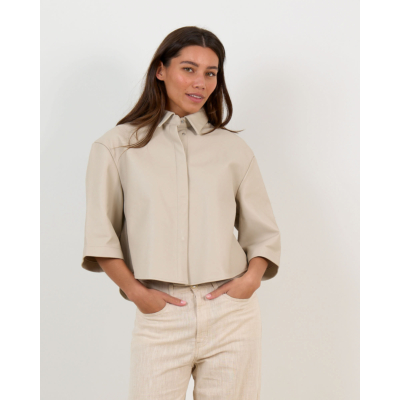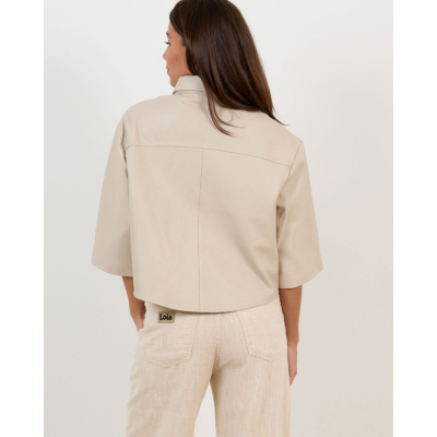 This sophisticated leather blouse combines luxurious sheepskin with contemporary design. The off-white tone creates a refined foundation, while the relaxed fit ensures comfortable wear throughout the day. Three-quarter sleeves provide versatility, and the classic collar with button closure adds structured elegance. Crafted from 100% sheepskin by Alter Ego, this women's clothing piece features contrasting stitching details that highlight the premium craftsmanship. The cropped silhouette brings modern appeal to this timeless leather essential.