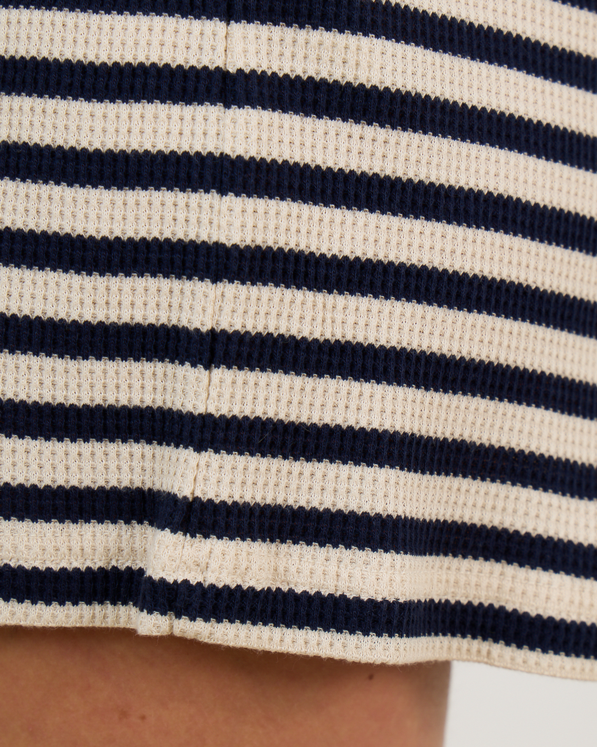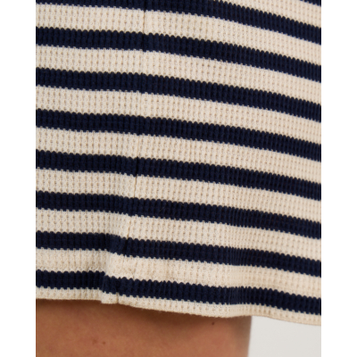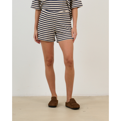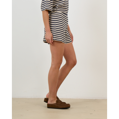These stylish striped shorts showcase a timeless navy and ecru pattern crafted from 100% organic cotton. The regular fit ensures comfortable wear while the ribbed texture adds sophisticated detail to this women's clothing piece. The elastic waistband provides a perfect fit, and the classic horizontal stripes create a nautical elegance. Ame Antwerp delivers contemporary design with these versatile shorts that transition beautifully from casual to chic occasions.