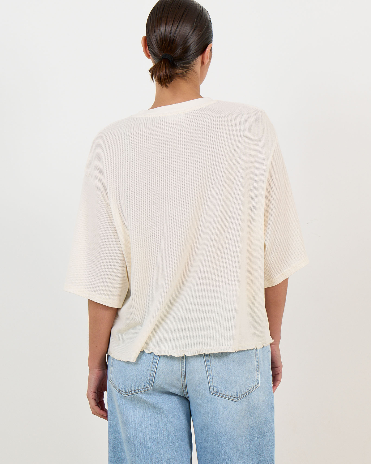 Style this oversized tee with tailored trousers for a balanced silhouette, or pair with denim shorts for relaxed weekend looks. Layer under structured blazers for smart-casual occasions, or combine with wide-leg jeans and statement accessories for trend-conscious styling.