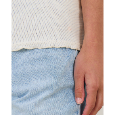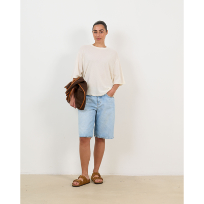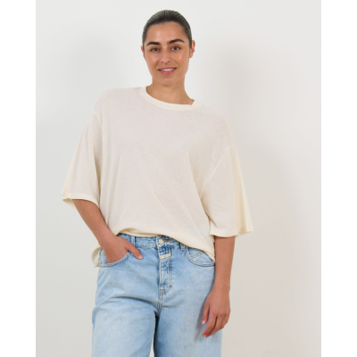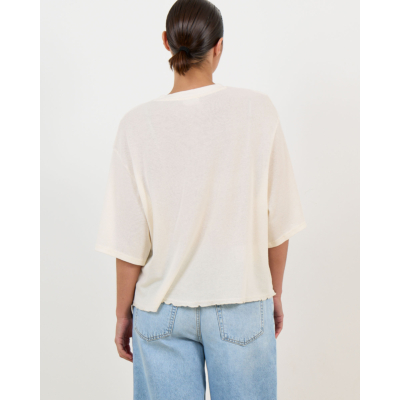This oversized women's clothing piece from American Vintage features a relaxed silhouette in off-white with three-quarter sleeves and a round neckline. The textured cotton fabric creates a distinctive surface pattern, while the oversized fit delivers contemporary comfort. Crafted from 100% organic cotton, this tee combines quality materials with modern styling for versatile wear.