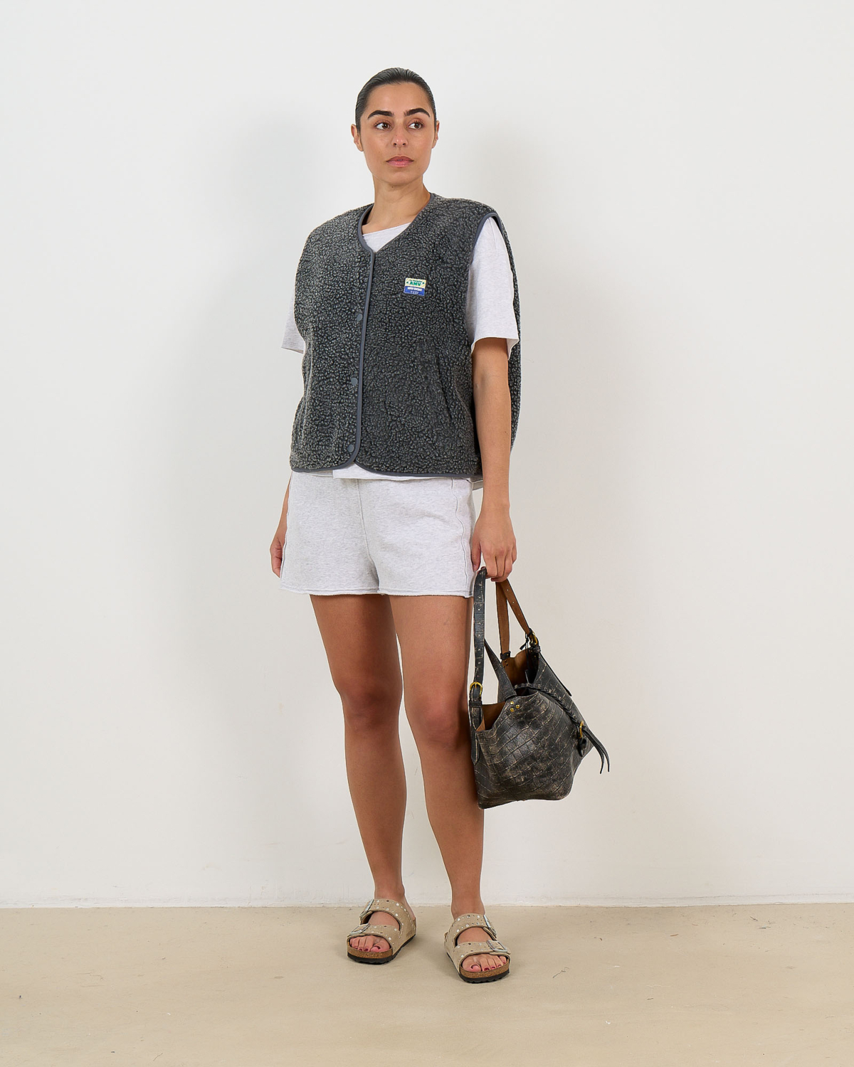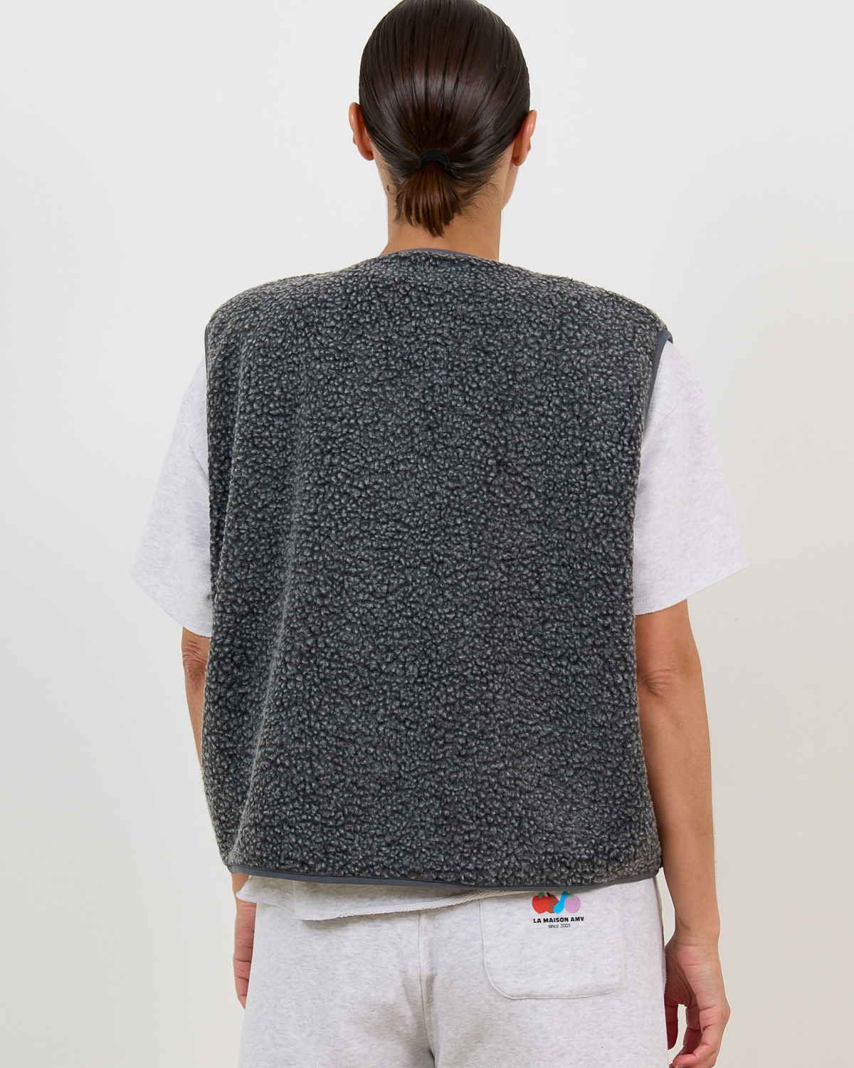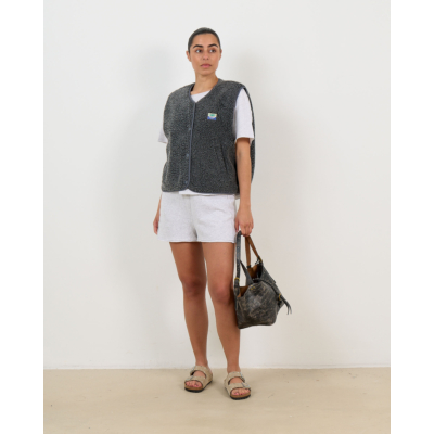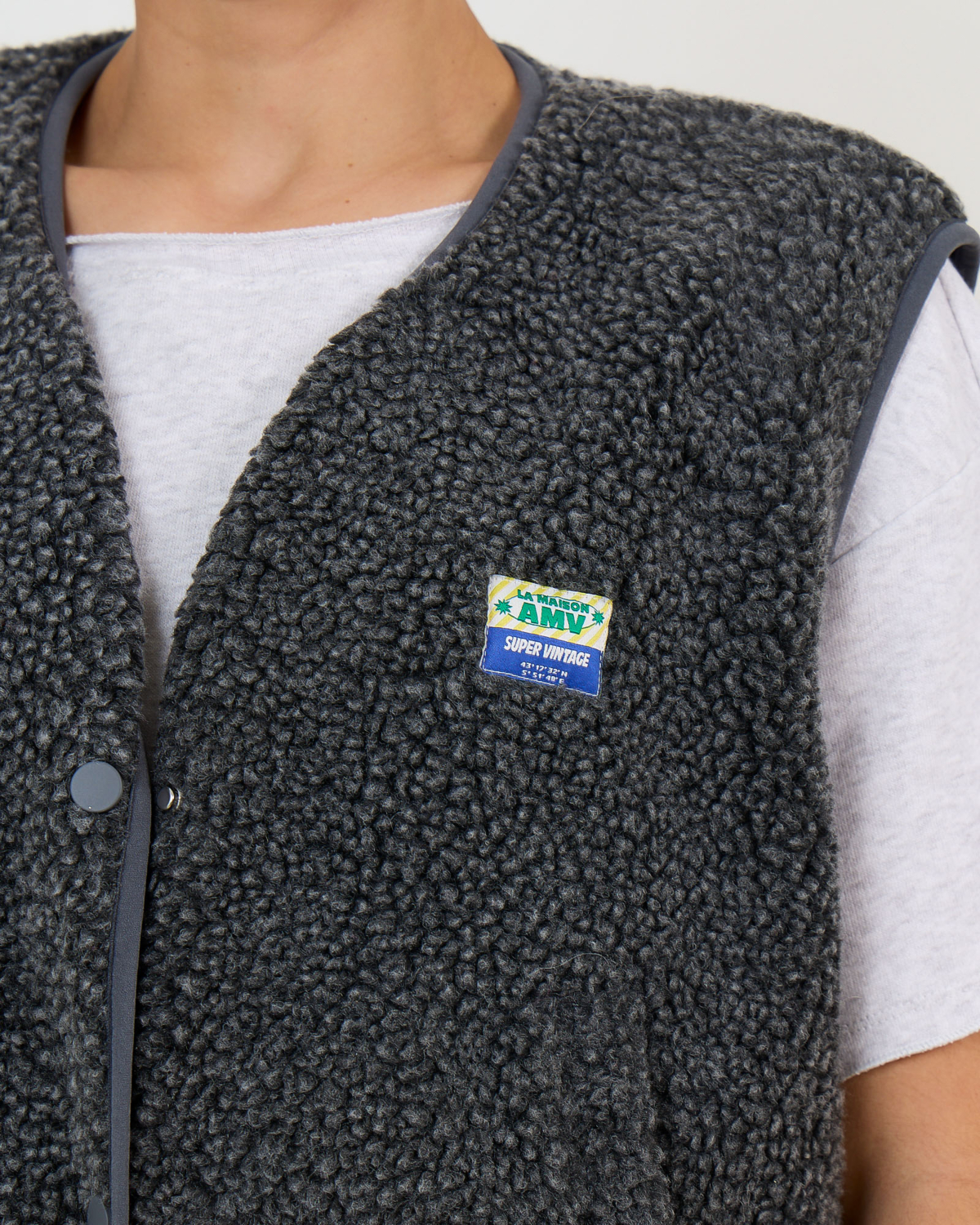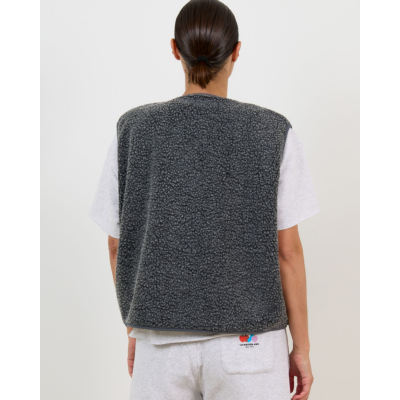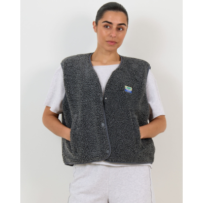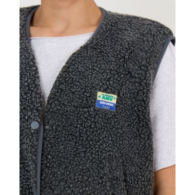 This grey sleeveless teddy vest brings contemporary style to your women's clothing collection. Crafted from 100% polyester with a luxurious textured finish, this piece features snap button closures and practical side pockets. The relaxed fit creates a comfortable yet refined silhouette. The V-neckline adds an elegant touch to this versatile outerwear piece by American Vintage.