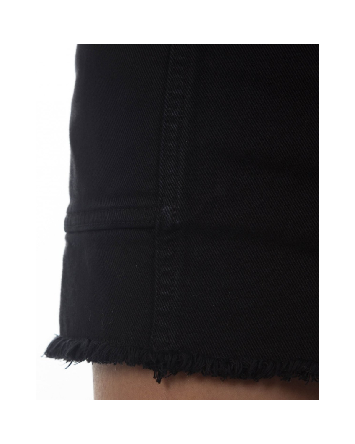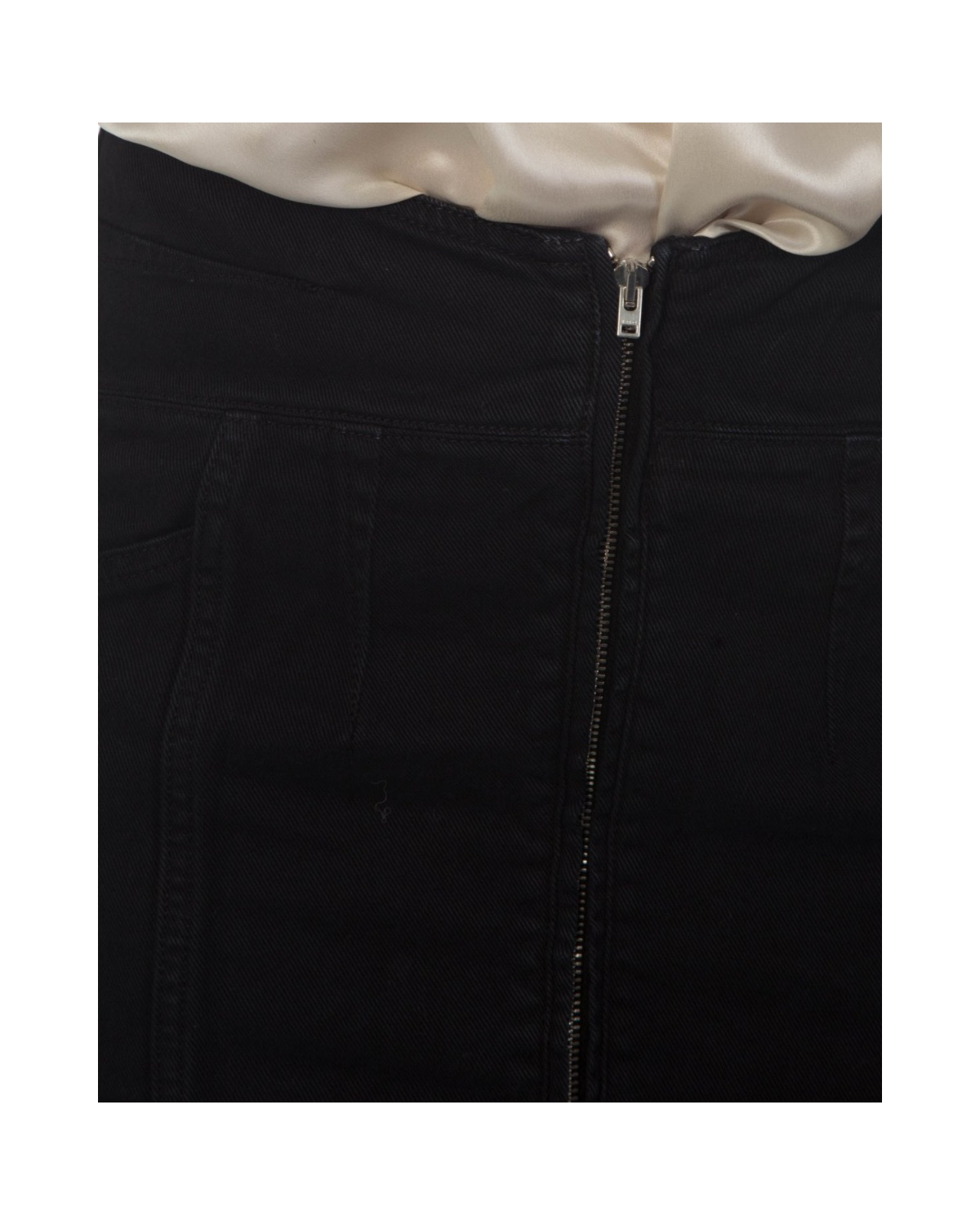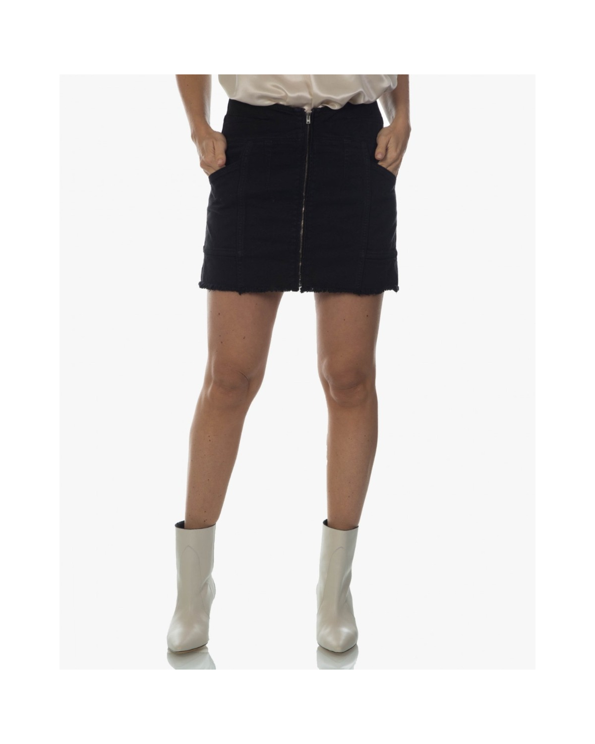 Denim iro skirt has a close fit. The mini skirt has side pockets on the hip and has a silver zipper on the front. The underside has an unfinished look & feel.