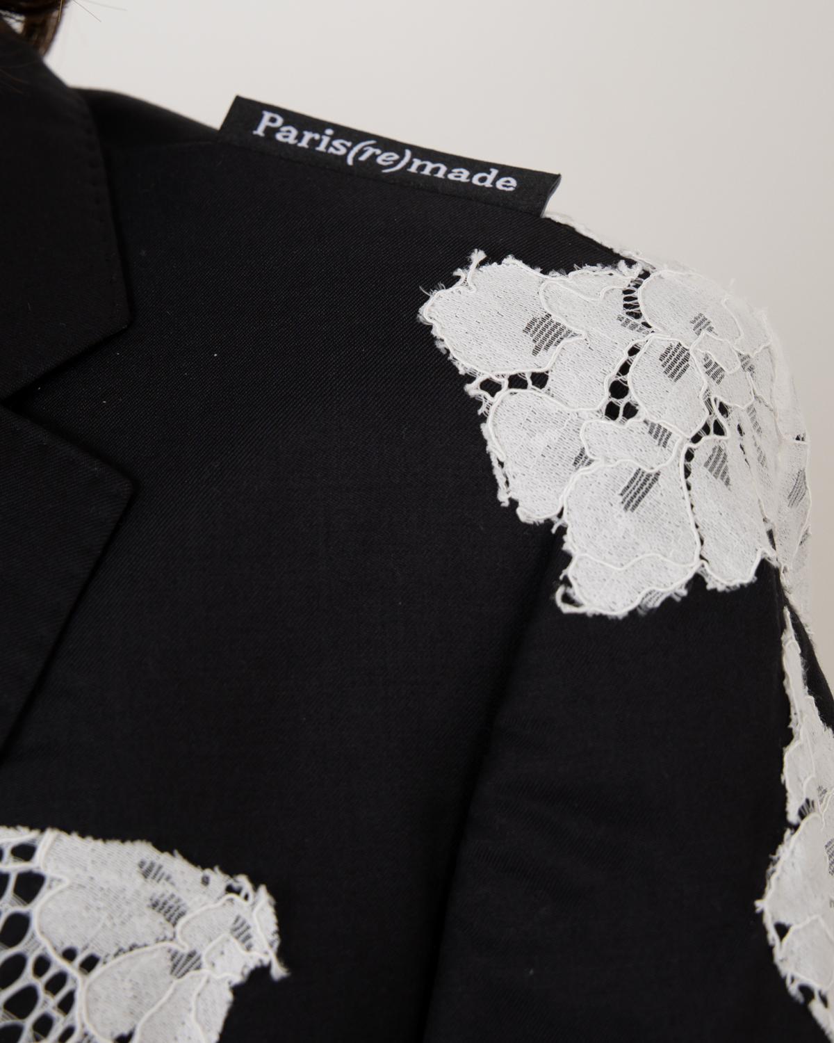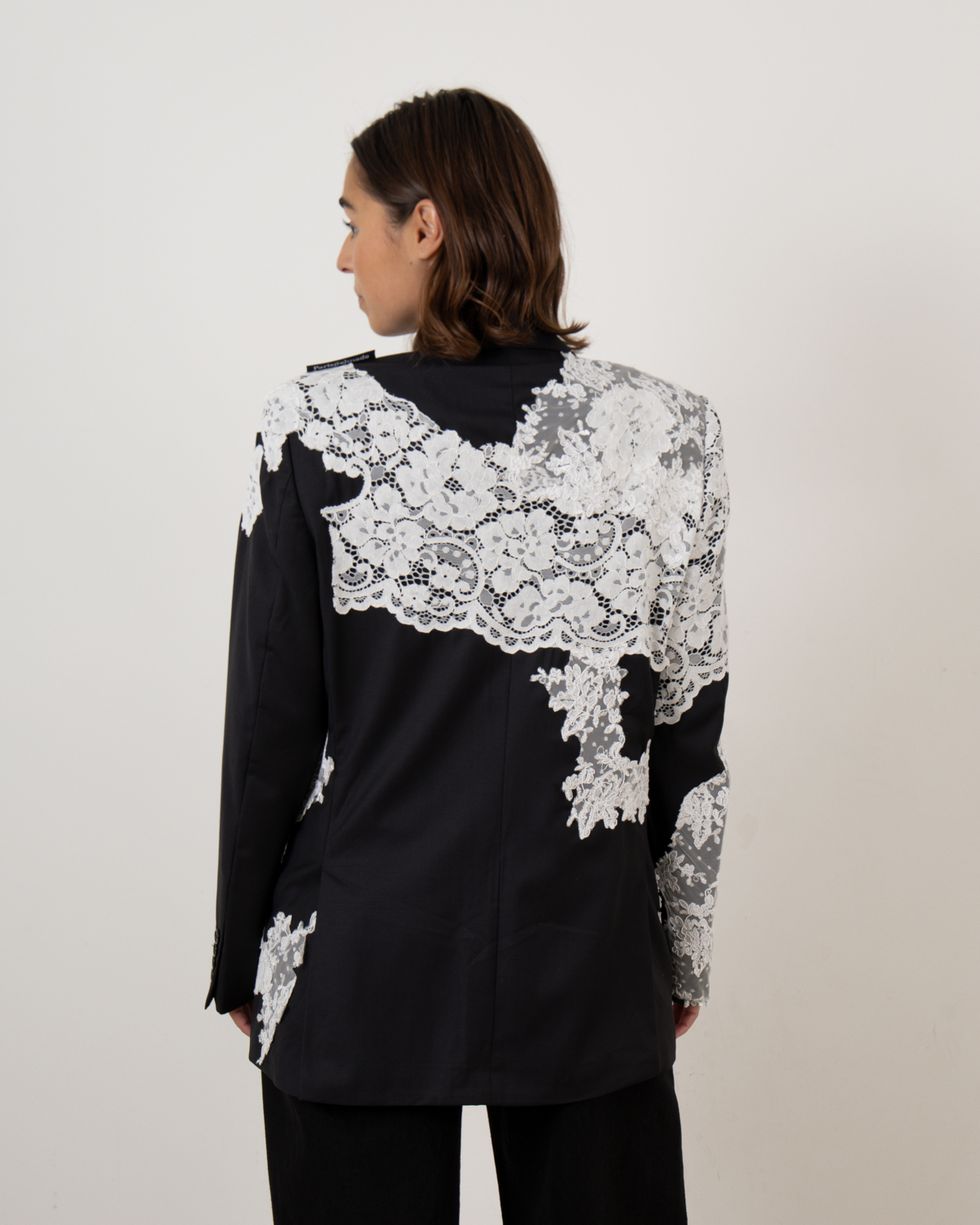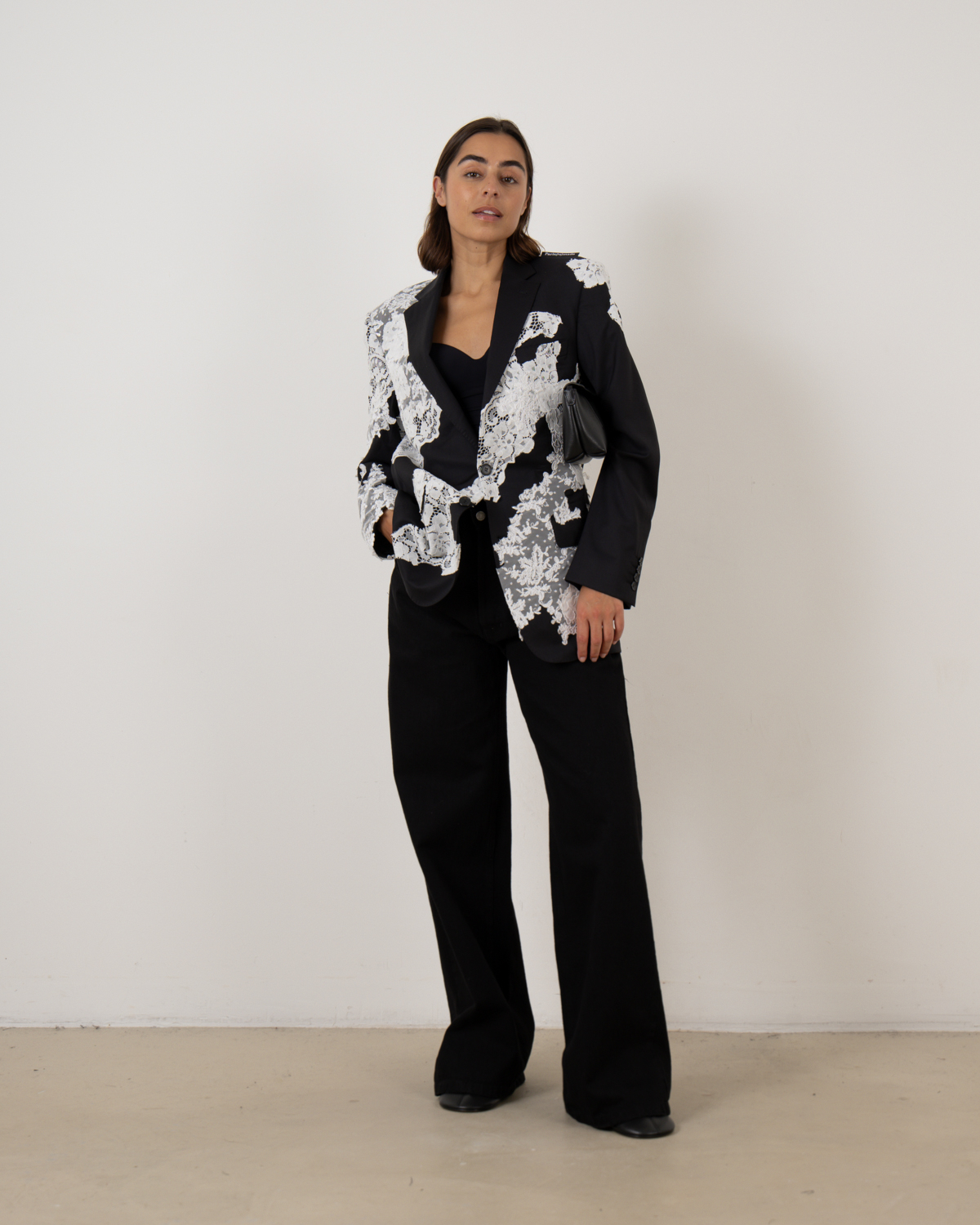 Style this statement blazer with tailored black trousers for a coordinated look, or pair with sleek dark denim for a modern twist. The dramatic lace pattern works beautifully with minimalist pieces that let the blazer take center stage.