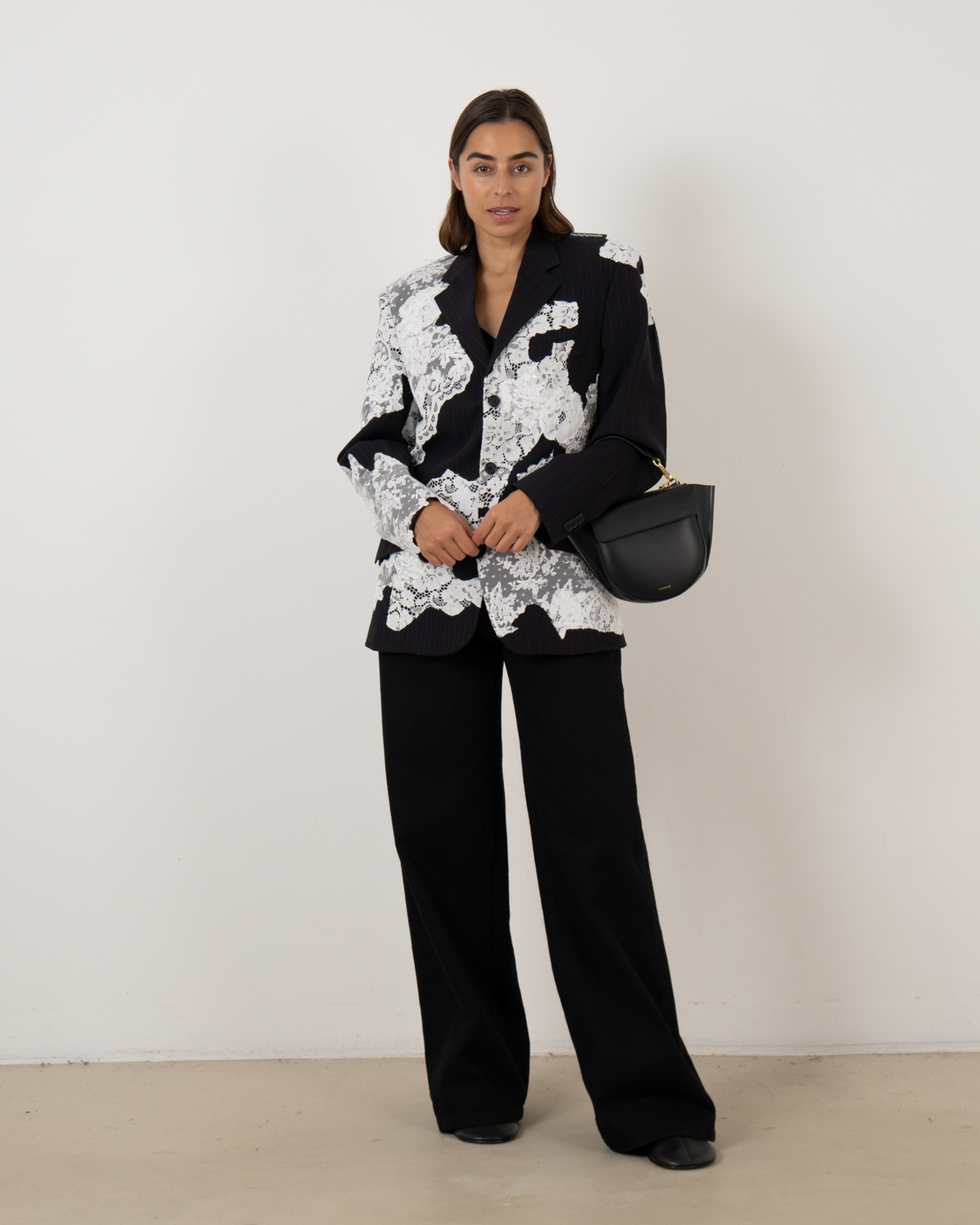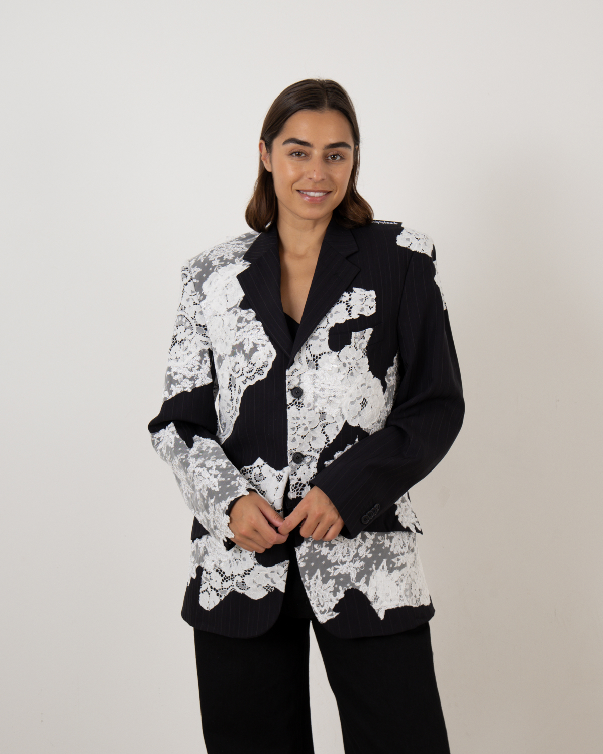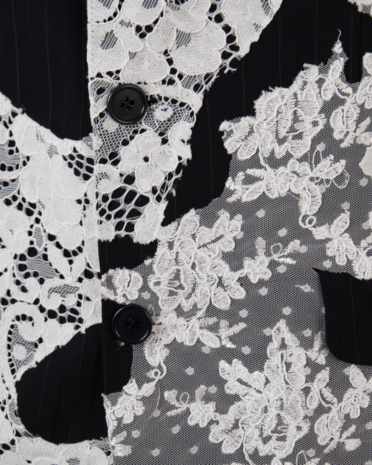 This striking black blazer showcases an artistic white lace overlay that creates a dramatic contrast across the entire garment. The classic notched lapels frame the double-breasted silhouette, secured with black buttons that complement the sophisticated design. Long sleeves and a structured fit deliver professional polish, while the intricate lace detailing adds feminine allure. Created by 1/OFF, this statement piece transforms traditional women's clothing into contemporary art.
