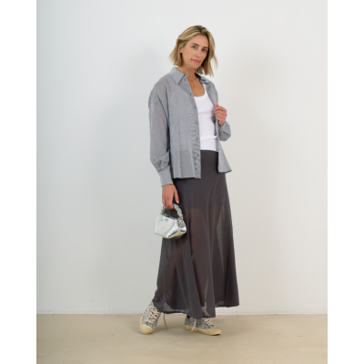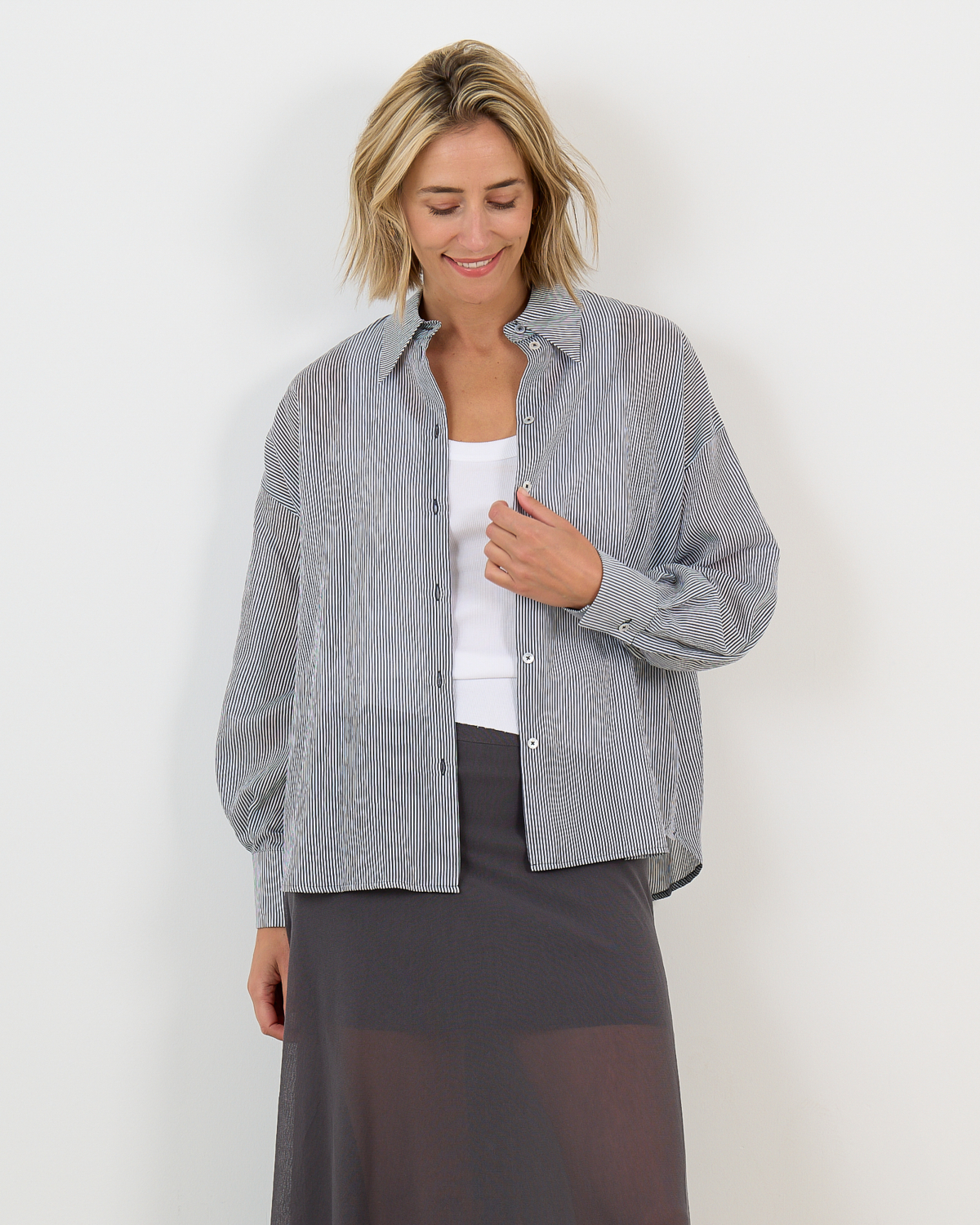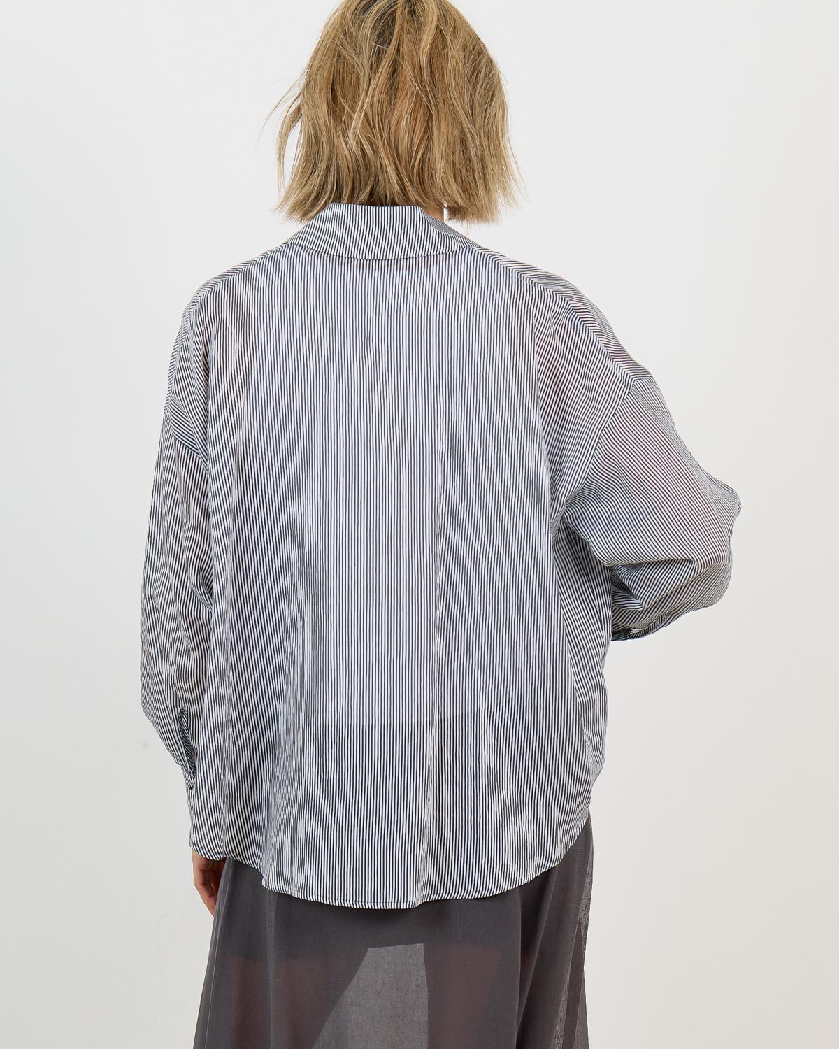 The relaxed silhouette makes this striped shirt ideal for versatile styling. Layer it over a fitted white tee and pair with tailored trousers for professional settings, or wear it open as a lightweight jacket over dresses. The timeless pinstripe design complements both neutral tones and bold colors in your wardrobe.