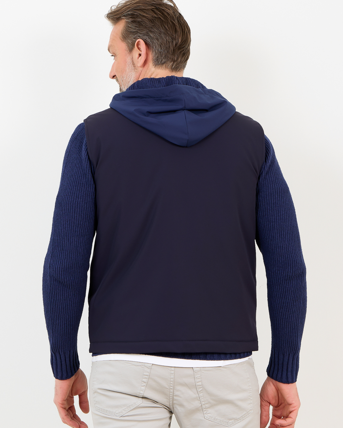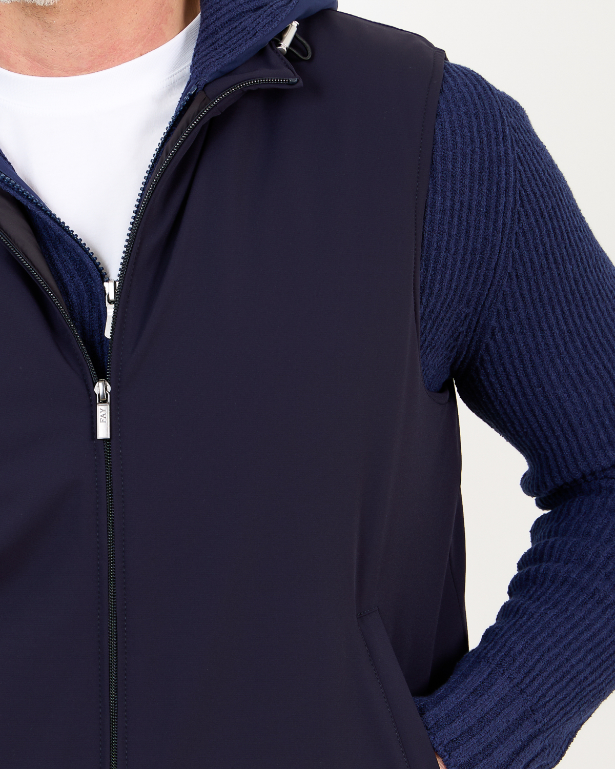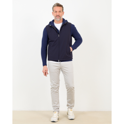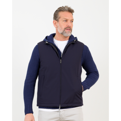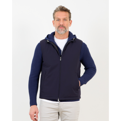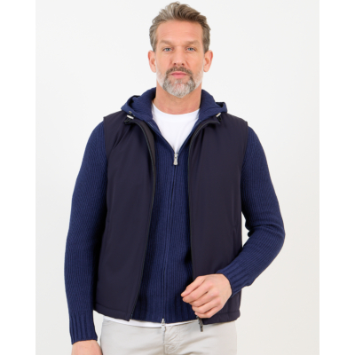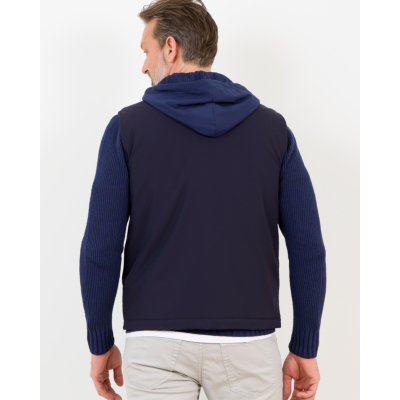 This navy men's clothing piece seamlessly blends function with refined style. The bodywarmer features a sleek hooded design with ribbed knit sleeves that provide comfortable stretch and warmth. Crafted from 82% polyamide and 18% elastane, the fabric offers excellent flexibility while maintaining its shape. The full-zip front closure ensures easy layering, while practical side pockets add functionality. This Fay bodywarmer comes in a regular fit that flatters your silhouette.