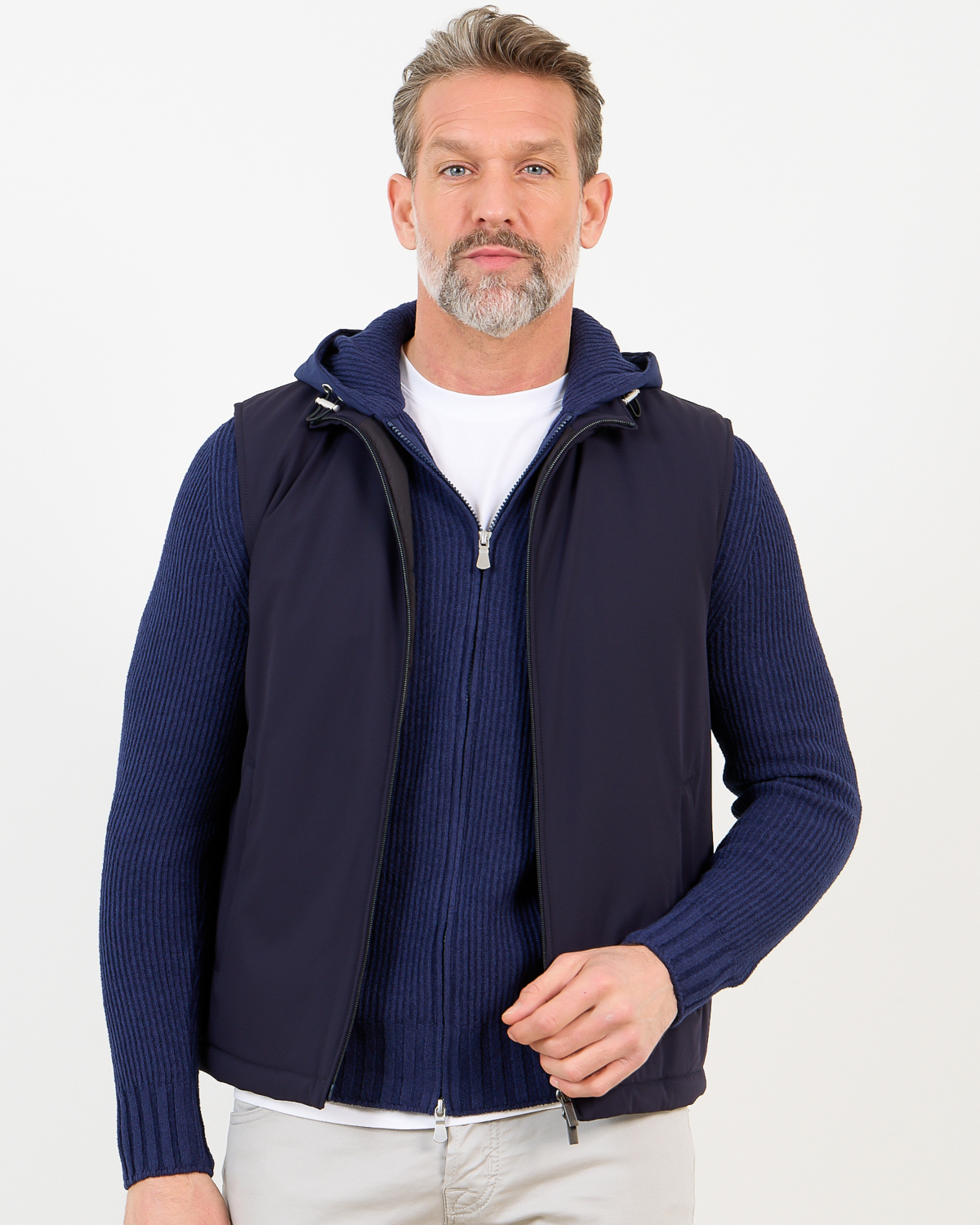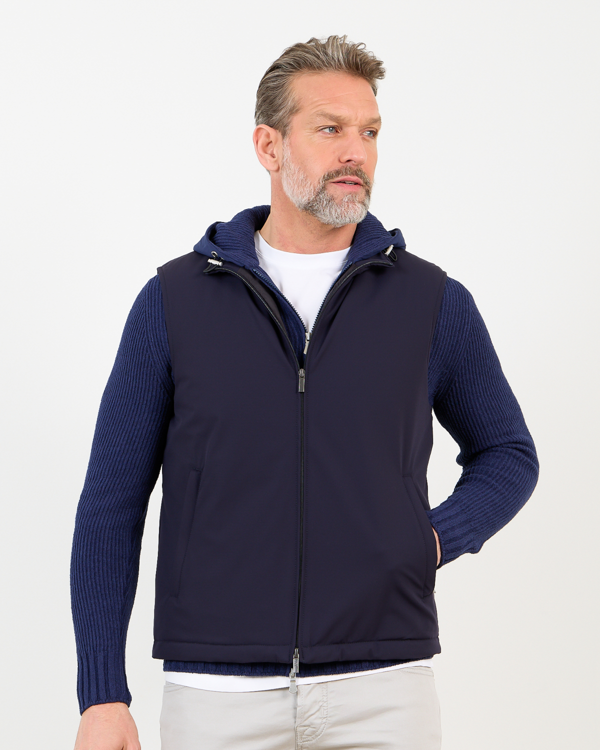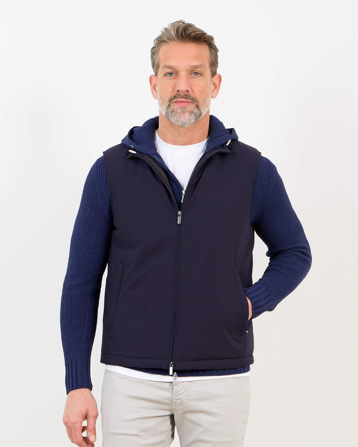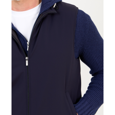 Layer this navy bodywarmer over a crisp white shirt for smart-casual occasions, or wear it with a fine knit sweater and tailored trousers for weekend styling. The versatile navy shade complements both light chinos and dark denim perfectly.