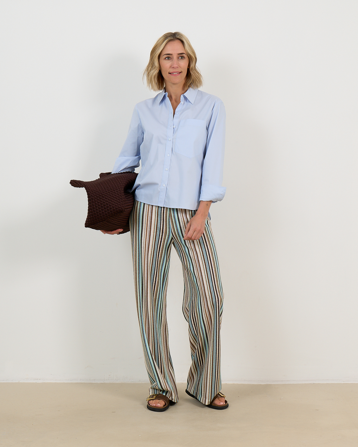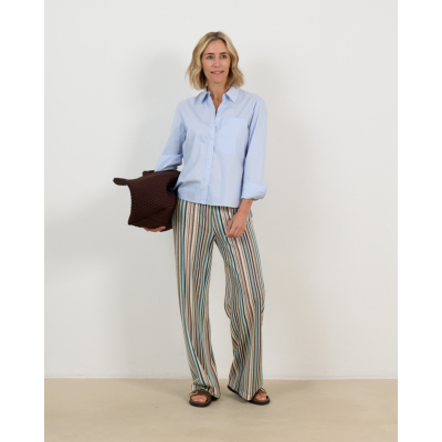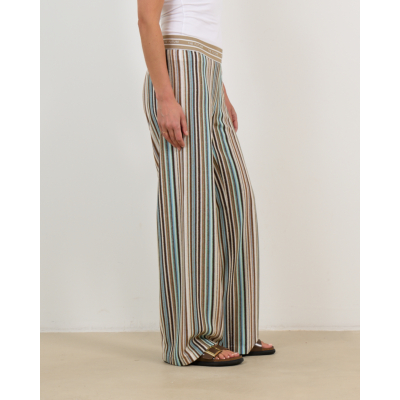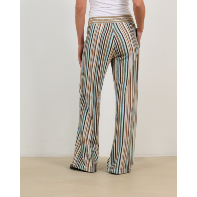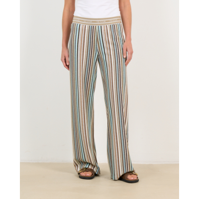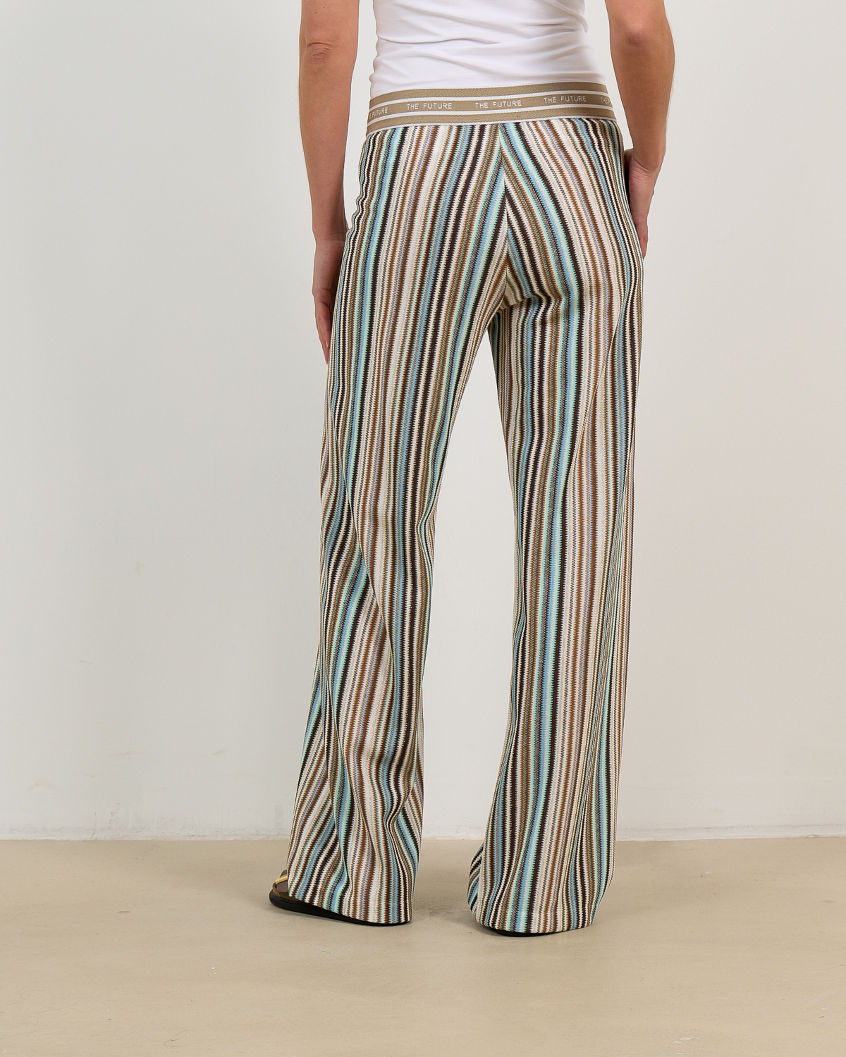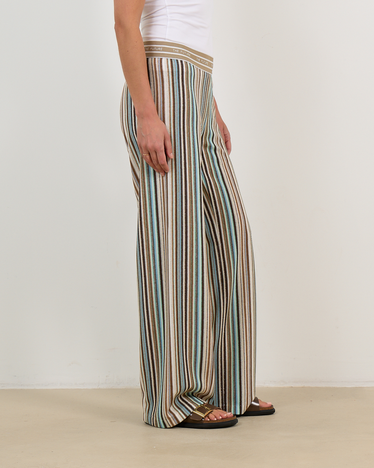 These striking striped trousers showcase a contemporary multicoloured pattern in beautiful blue tones combined with coffee and cream accents. The regular fit creates a flattering silhouette while the elastic waistband with "THE FUTURE" text detail adds a modern touch. Crafted from a premium blend of 33% modal, 29% polyester, 26% cotton, and 12% viscose, these women's clothing pieces offer exceptional comfort and movement. The wide-leg cut flows gracefully, making them perfect for both casual and elevated occasions.