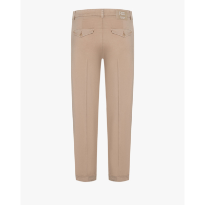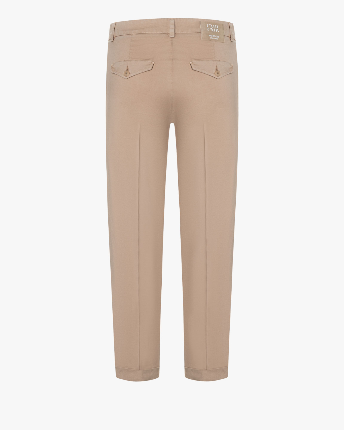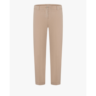 These sophisticated sand-colored turn-up trousers combine timeless elegance with modern comfort. Crafted from a premium cotton blend of 97% cotton and 3% elastane, they offer the perfect balance between structure and flexibility. The slim fit silhouette creates a flattering shape, while the classic front pleats and turned-up hems add refined detail. The button closure and belt loops complete the polished design. These women's clothing essentials from Cambio feature subtle back pocket details that enhance the sophisticated aesthetic. Perfect for creating versatile looks paired with crisp white shirts for business occasions or soft knits for weekend elegance.