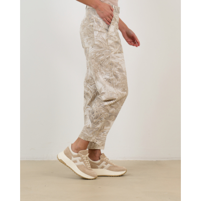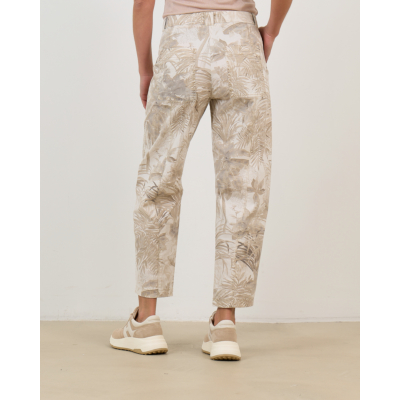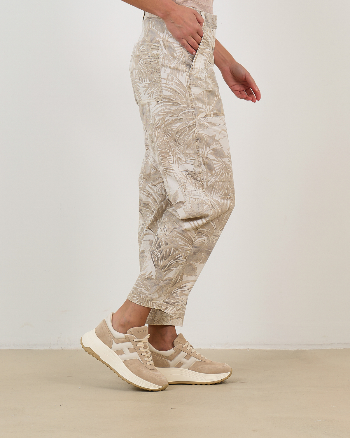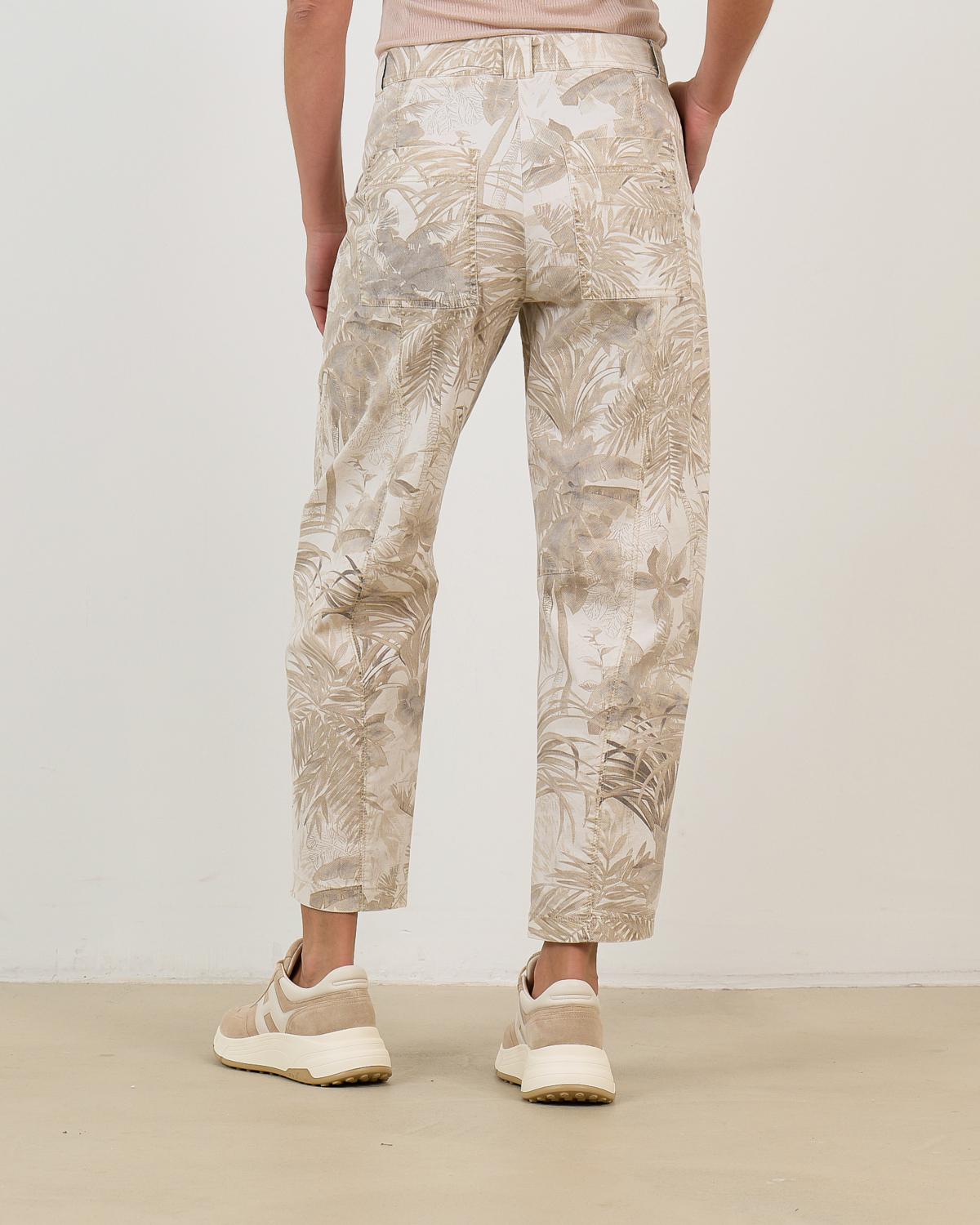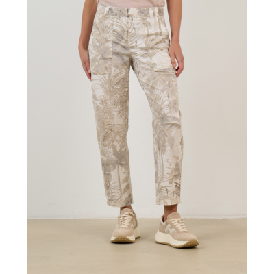These striking cargo trousers feature an exotic white palm leaf print that instantly elevates your women's clothing collection. Crafted from 97% cotton with 3% elastane, the fabric offers comfort and flexibility throughout the day. The regular fit silhouette creates a flattering shape while multiple cargo pockets add both functionality and contemporary edge. The tropical palm motif brings botanical elegance to this versatile design by Cambio.