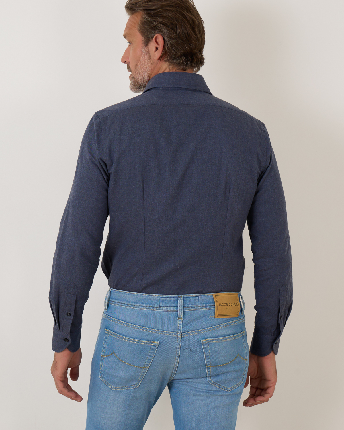 This navy shirt from Xacus combines refined Italian craftsmanship with contemporary men's fashion. The 100% cotton fabric feels soft against your skin while maintaining its structured appearance throughout the day. The Tailor Fit cut creates a streamlined silhouette that flatters your torso. Featuring a classic spread collar and full button closure with matching navy buttons, this long-sleeved shirt showcases subtle texture details that catch the light beautifully.