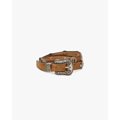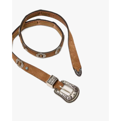 This striking brown leather belt from Golden Goose embodies Western sophistication. Crafted in rich beige leather, the belt features an ornate silver-toned buckle with intricate floral engravings and star details. Decorative metal conchos adorned with Western motifs accent the strap, while multiple adjustment holes ensure a perfect fit. The pointed leather tip adds an authentic cowboy touch to this luxurious women's clothing accessory.