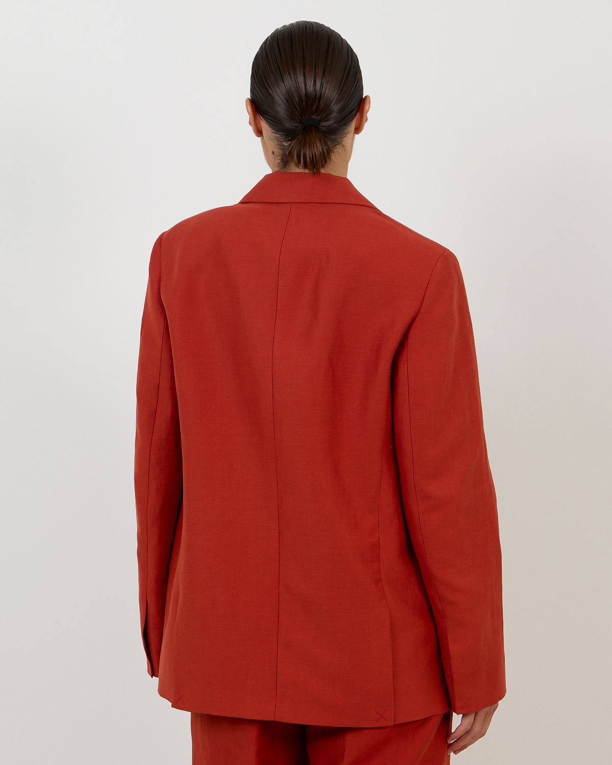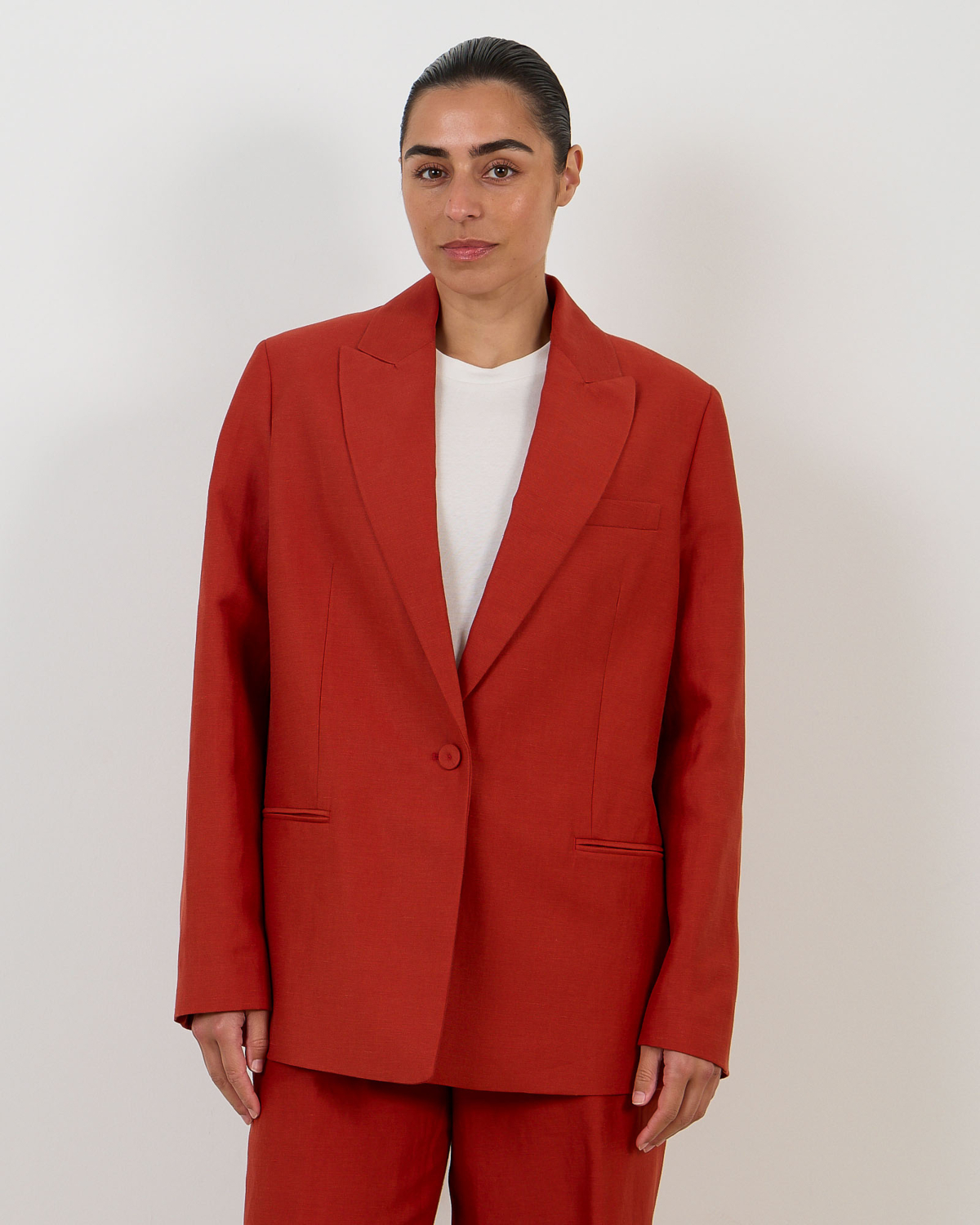 Style this blazer with matching red trousers for a coordinated suit look, or pair it with dark denim and heels for contemporary contrast. Layer over crisp white shirts for professional settings, or combine with tailored black pieces for timeless versatility.