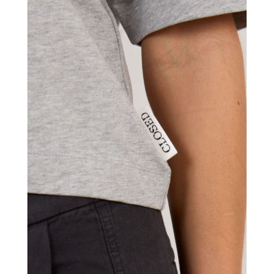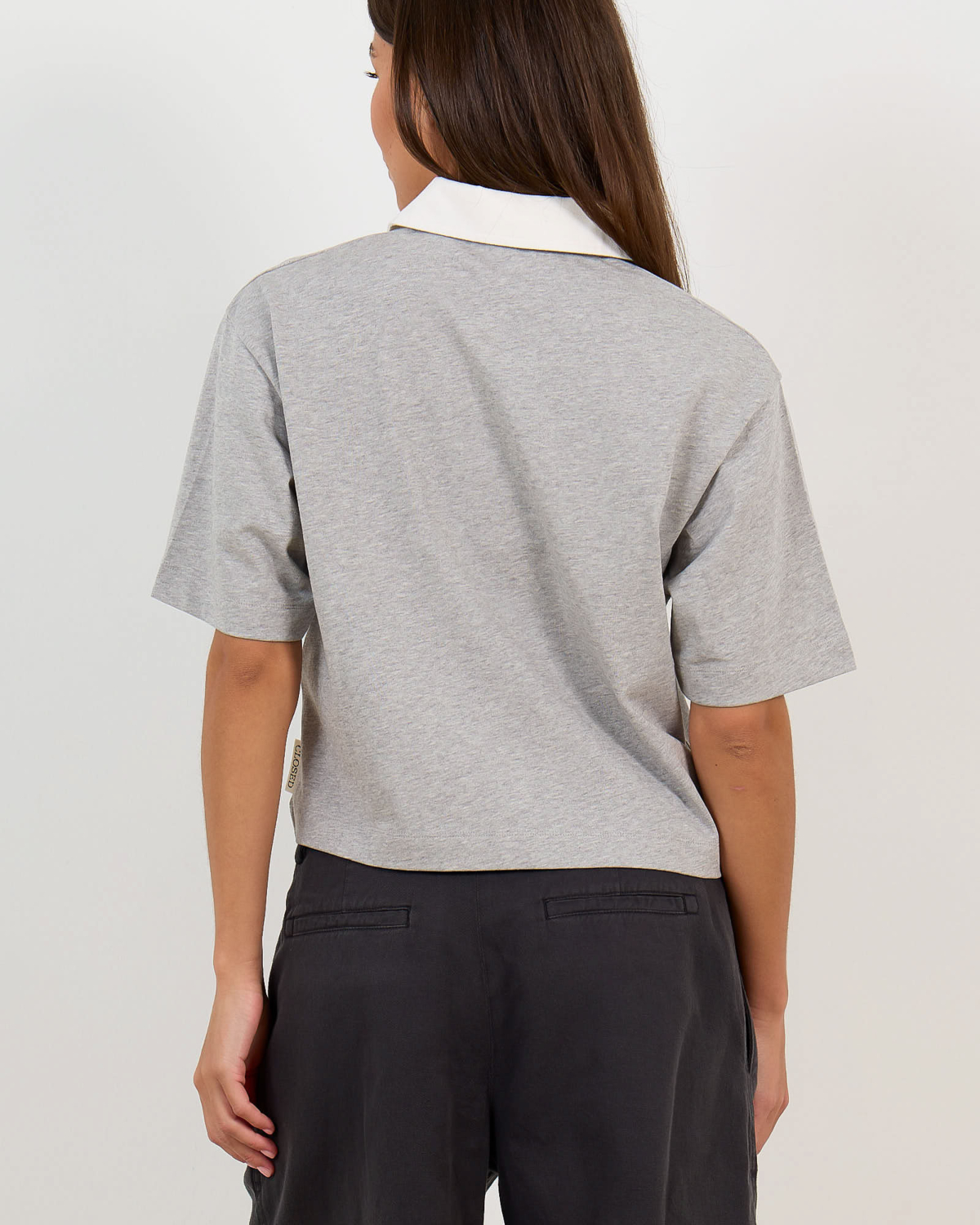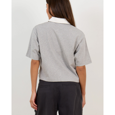 This grey cropped polo shirt brings contemporary elegance to classic sportswear-inspired women's clothing. The sophisticated grey melange fabric creates a refined base, while the crisp white collar adds a striking contrast that elevates the design. Crafted from 100% cotton, this piece features a boxy fit that offers both comfort and modern style. The short sleeves and cropped length create a fresh silhouette, finished with a white button placket. Closed delivers quality construction with thoughtful details that make this piece stand out in your wardrobe.
