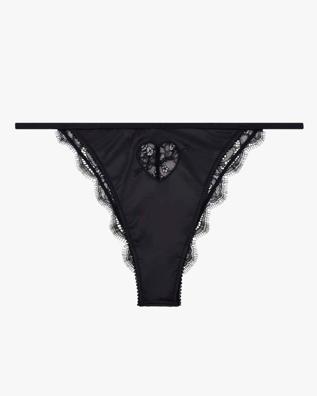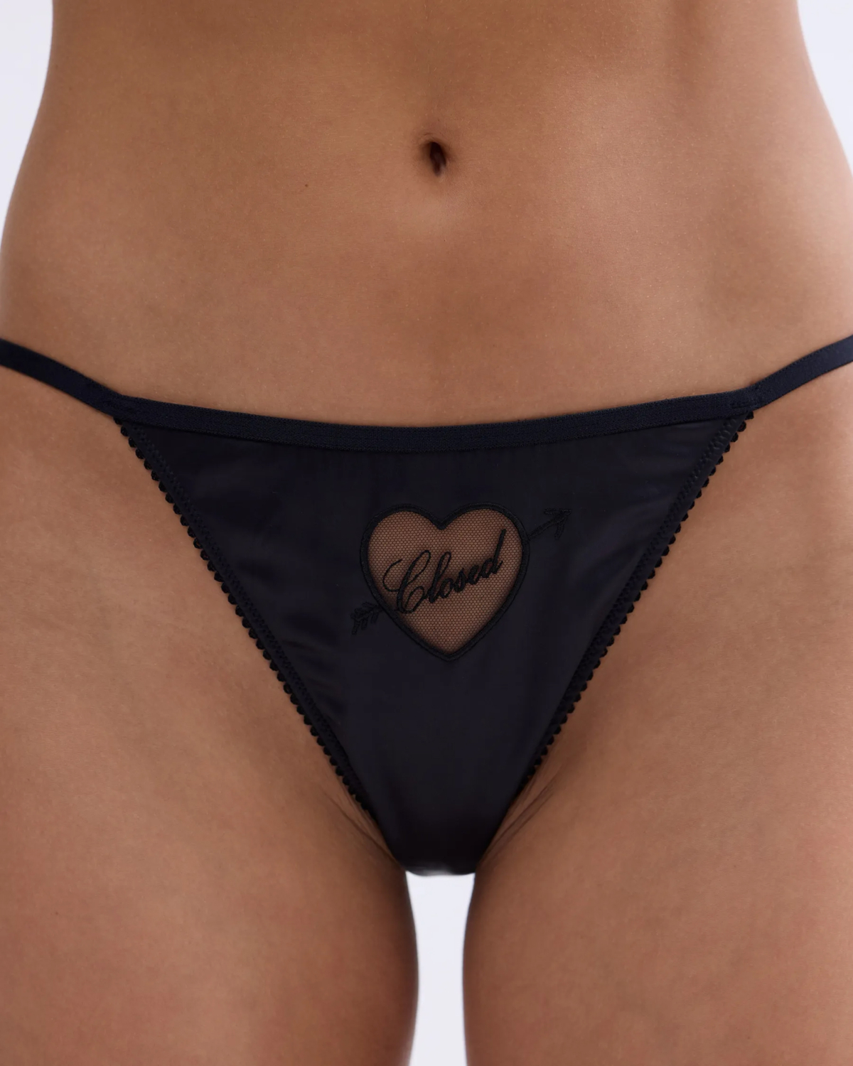 This striking black tanga features delicate lace trim along the edges and a distinctive mesh heart detail at the front center. The minimal coverage design showcases refined craftsmanship with thin elastic waistband and Brazilian-cut silhouette. Crafted from a premium blend of 28% recycled polyester, 27% recycled polyamide, 22% polyester, 17% polyamide, and 6% elastane for optimal stretch and comfort. This sophisticated women's clothing piece from Closed represents the perfect fusion of contemporary design and intimate apparel elegance.