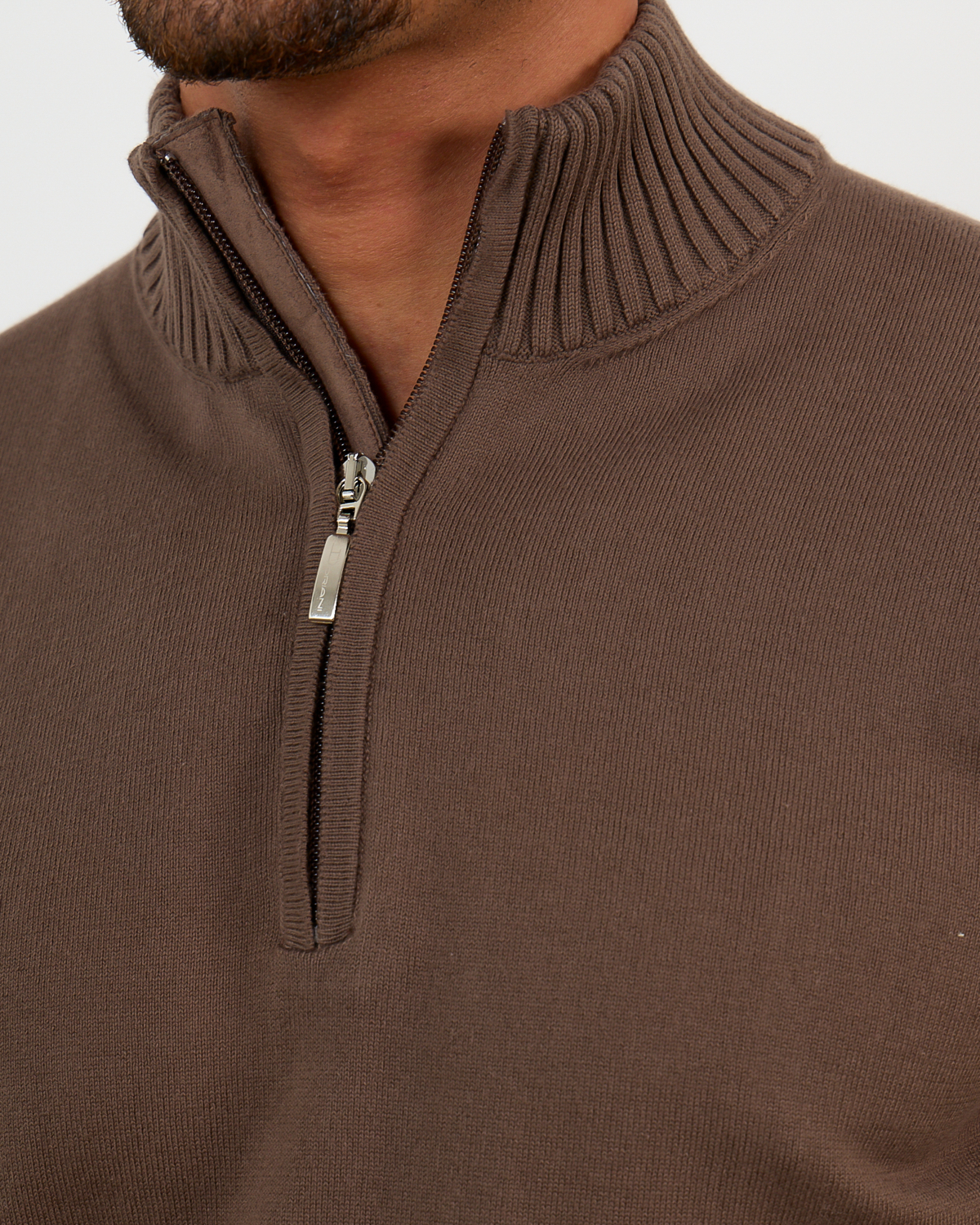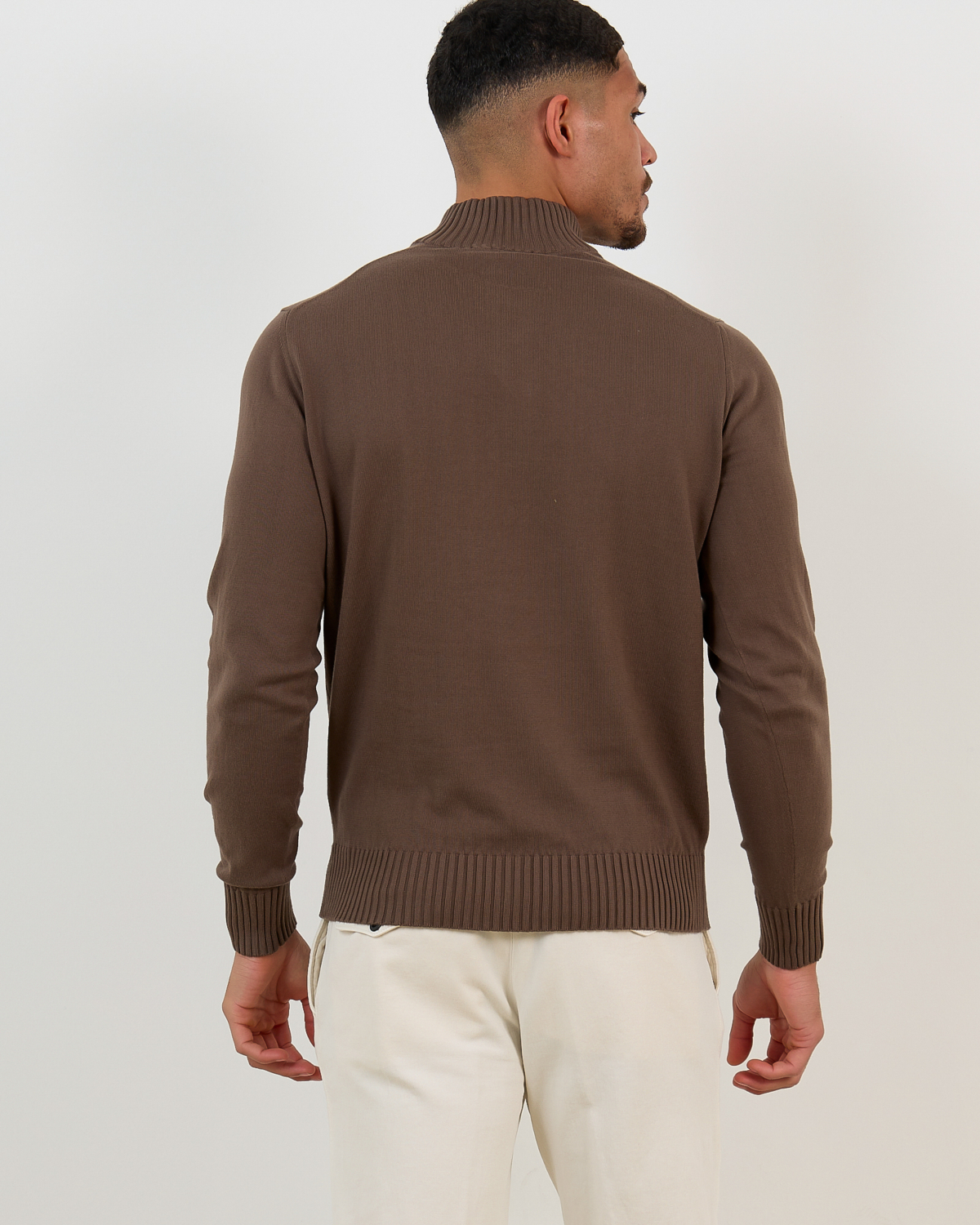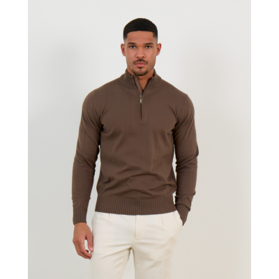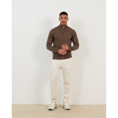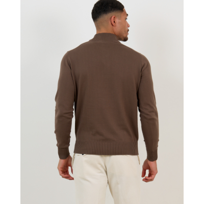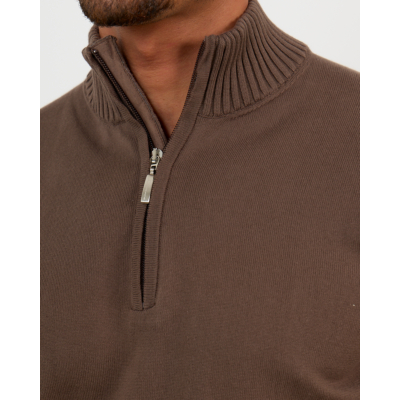 This brown zip pullover from Doriani Cashmere elevates men's clothing with its sophisticated design and premium quality. Crafted from 100% cotton in a warm light brown shade, the pullover features a ribbed collar, partial front zip closure, and long sleeves with ribbed cuffs. The regular fit ensures comfortable wear while maintaining a refined silhouette. The ribbed hem adds structural detail to complete this versatile knitwear piece.
