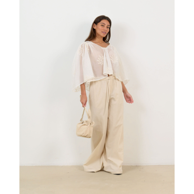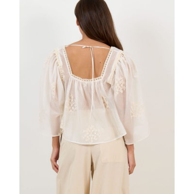 This romantic embroidered babydoll blouse in off white captures bohemian elegance perfectly. The delicate floral embroidery adorns the flowing fabric, while crochet trim details frame the V-neckline and open back beautifully. Crafted from a comfortable 80% Lyocell and 20% Polyester blend, this Drykorn piece features three-quarter sleeves and a relaxed fit that flatters every silhouette. The tie-back closure adds a playful feminine touch to this versatile women's clothing essential.