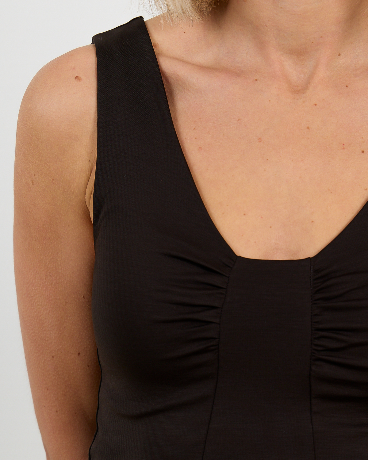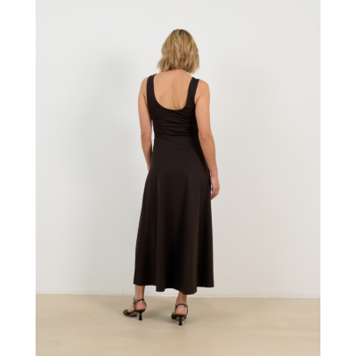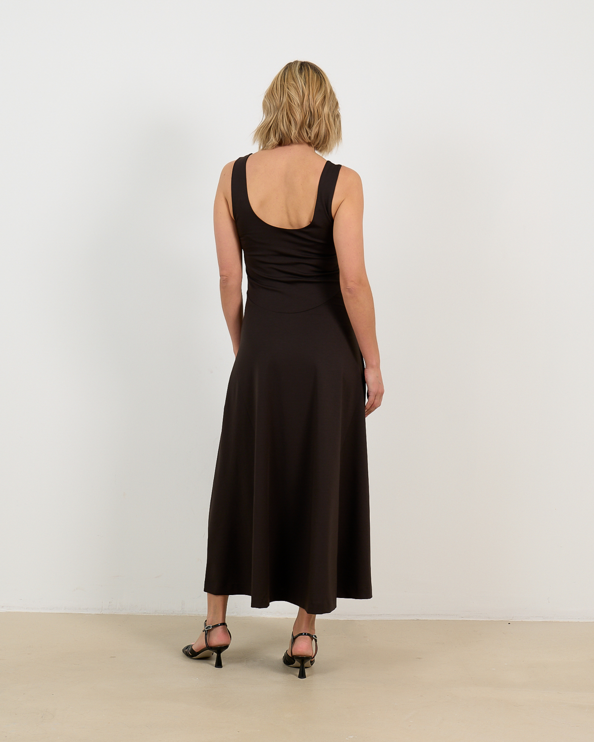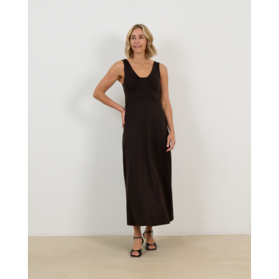 This sleeveless maxi dress in rich dark brown delivers sophisticated elegance with its clean lines and graceful silhouette. The V-neckline and gathered detail at the bust create a flattering focal point, while the regular fit flows beautifully to ankle length. Crafted from a luxurious blend of 73% lyocell, 23% polyamide, and 4% elastane, this Drykorn piece offers exceptional comfort and movement. The sleeveless design and smooth finish make it a versatile addition to your women's clothing collection.