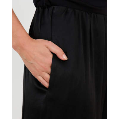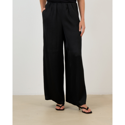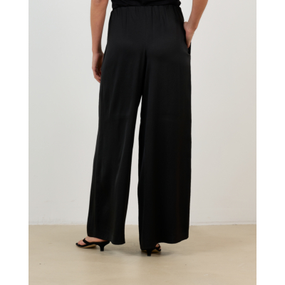 These black wide-leg trousers from Drykorn showcase contemporary women's clothing design with their flowing silhouette. The regular fit combines an elastic waistband with practical side pockets for modern functionality. Crafted from a luxurious blend of 95% acetate and 5% elastane, the fabric drapes beautifully while offering gentle stretch for comfortable movement throughout your day.