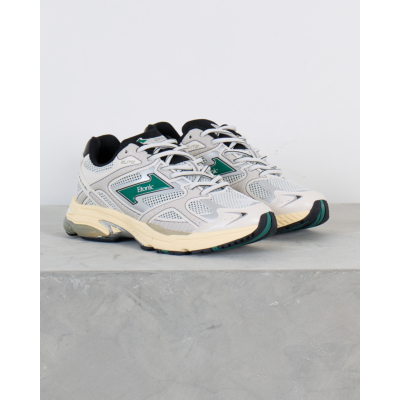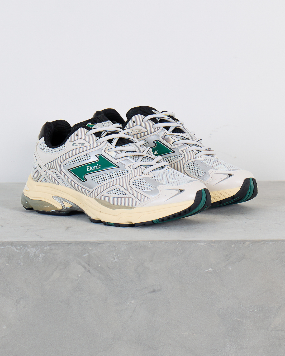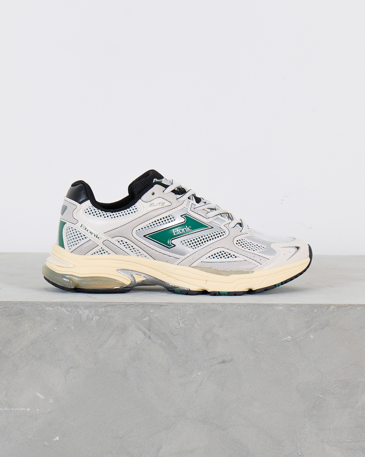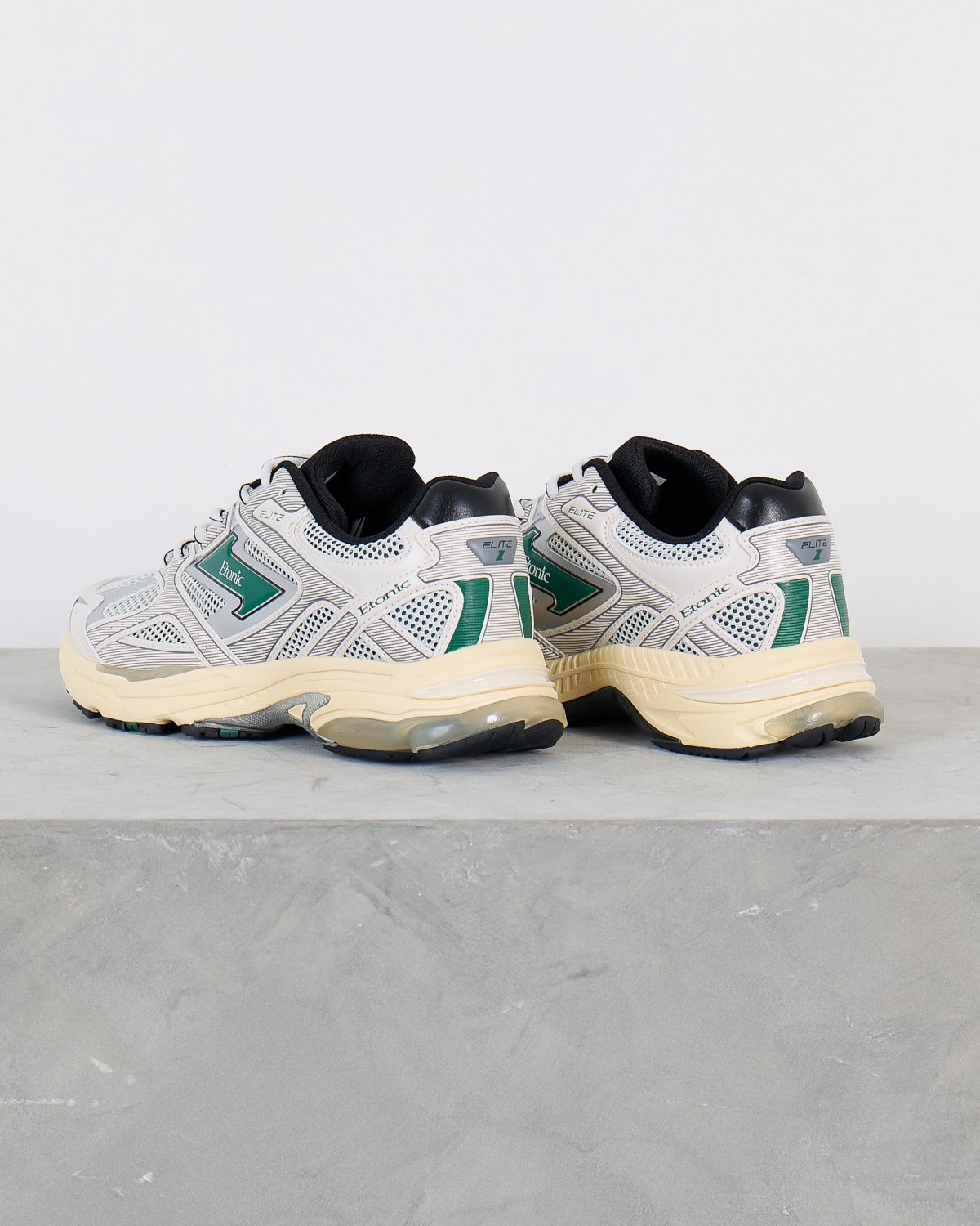These elite white sports sneakers from Etonic combine cutting-edge athletic performance with contemporary street style. The striking white leather and mesh upper features distinctive green logo detailing and dynamic perforated panels for enhanced breathability. Classic white laces complement the sleek low-top silhouette, while the cushioned cream midsole delivers superior comfort. Black collar padding and heel counter provide essential support during active wear.