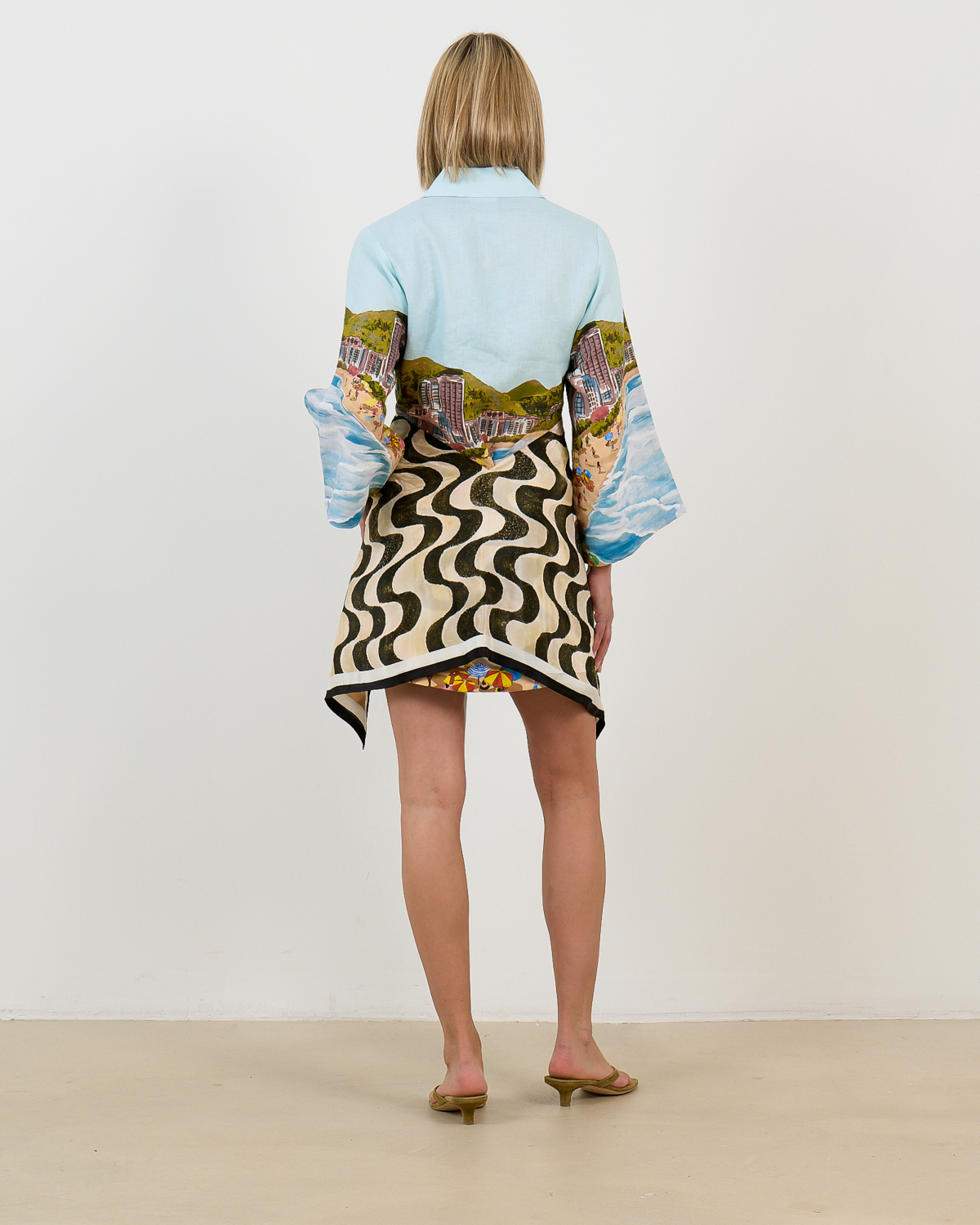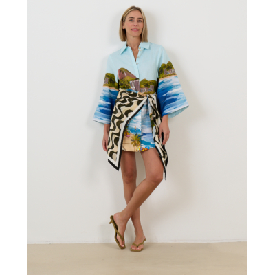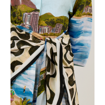 This striking women's clothing piece captures vacation vibes with its vibrant coastal print featuring beach scenes and city landscapes in soft blue tones. The Farm Rio design showcases long sleeves, a classic collar, and button closure crafted from 100% linen for breathable comfort. The regular fit silhouette includes a removable tie belt that creates a flattering waist definition. The multicolor print combines oceanic blues with architectural details and tropical elements for an eye-catching statement piece.