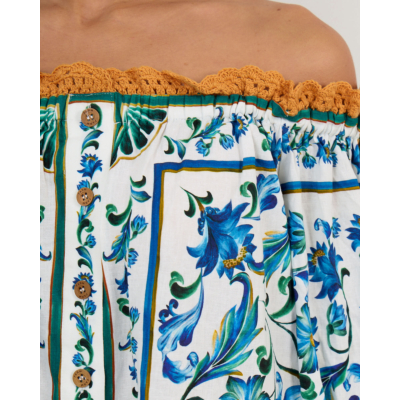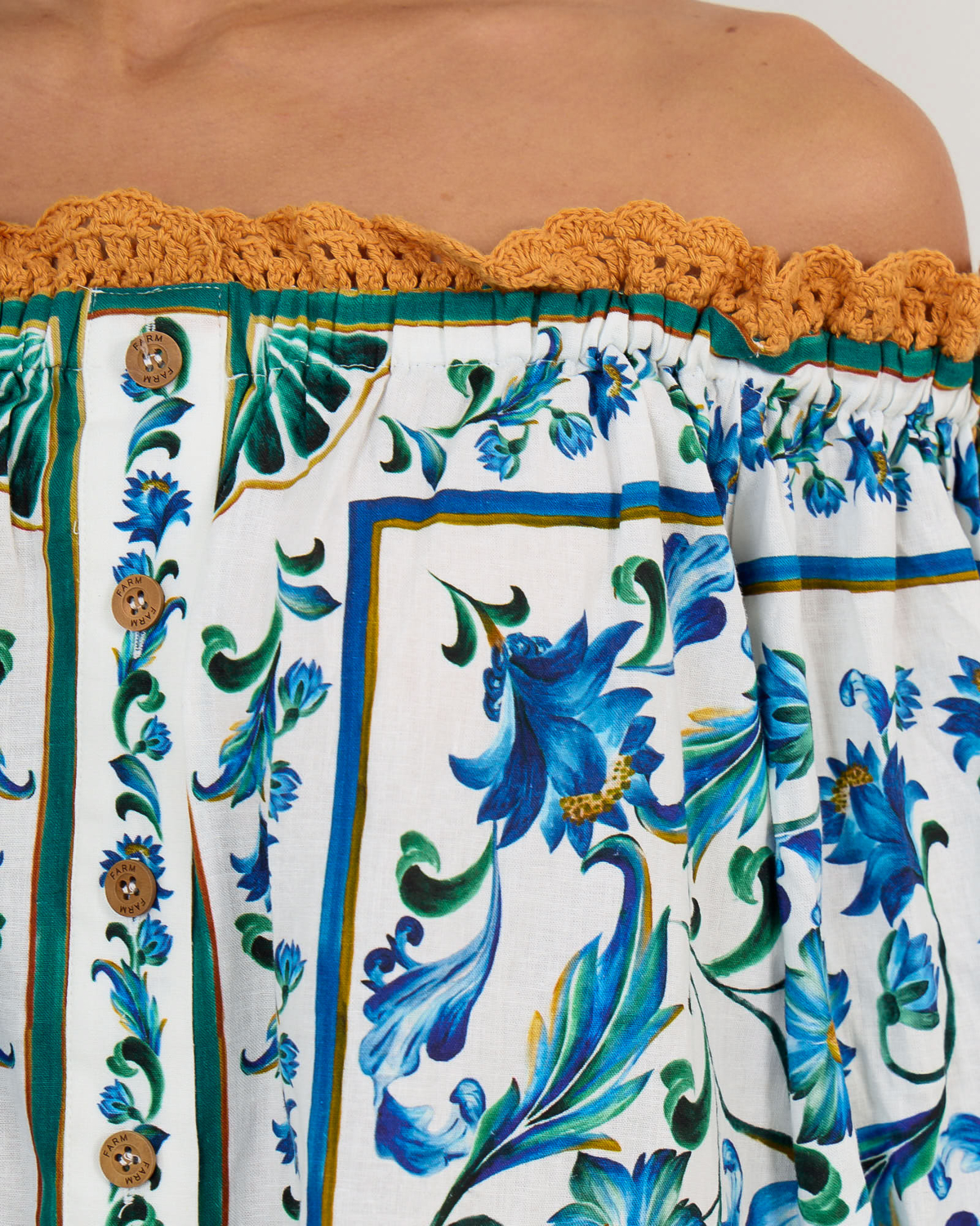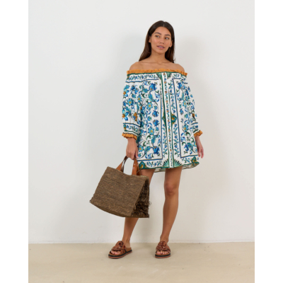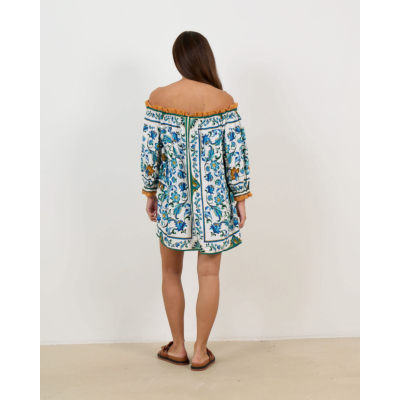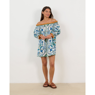 This striking off-shoulder mini dress showcases an enchanting tile-inspired floral pattern in vibrant blue and green tones against an off-white base. The off-shoulder design features elegant crochet trim detailing at the neckline and sleeves, while button-front closure with wooden buttons adds authentic charm. Crafted from a premium linen-viscose blend (55% linen, 45% viscose), this Farm Rio creation offers a relaxed fit with three-quarter gathered sleeves for ultimate comfort and movement.
