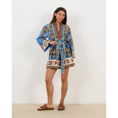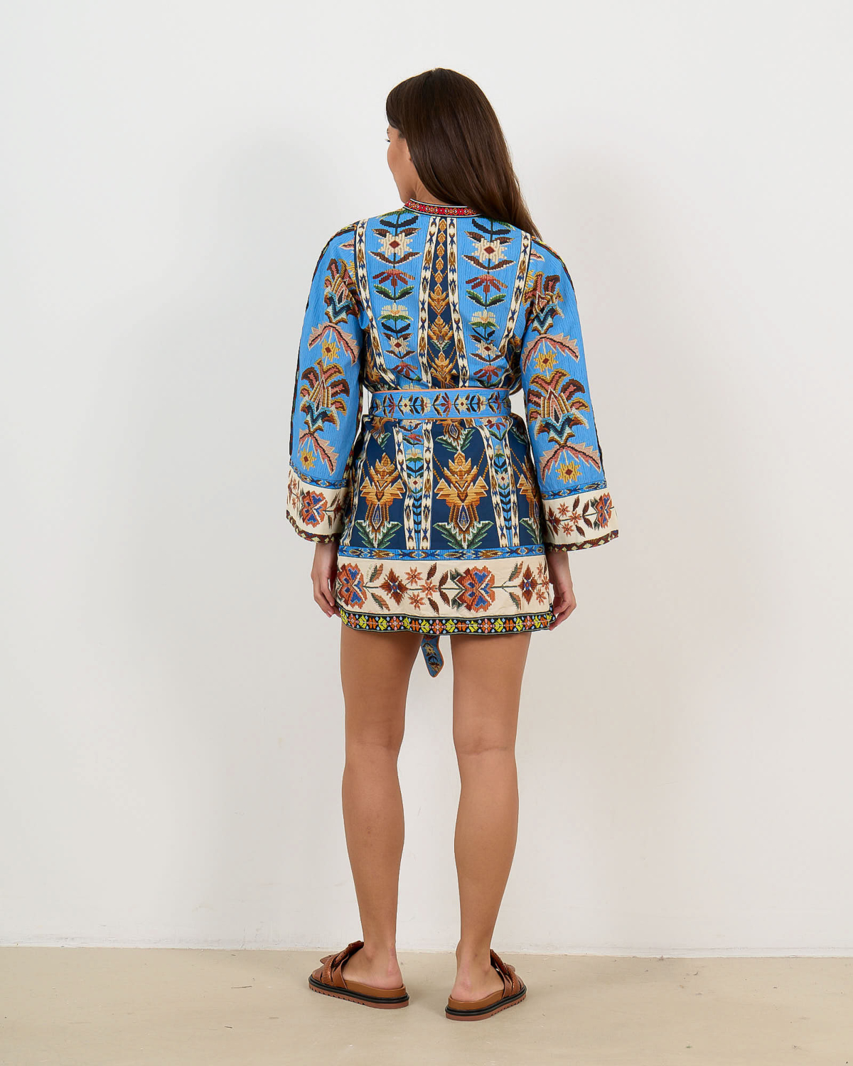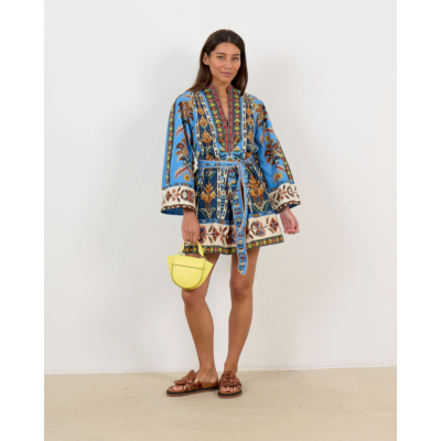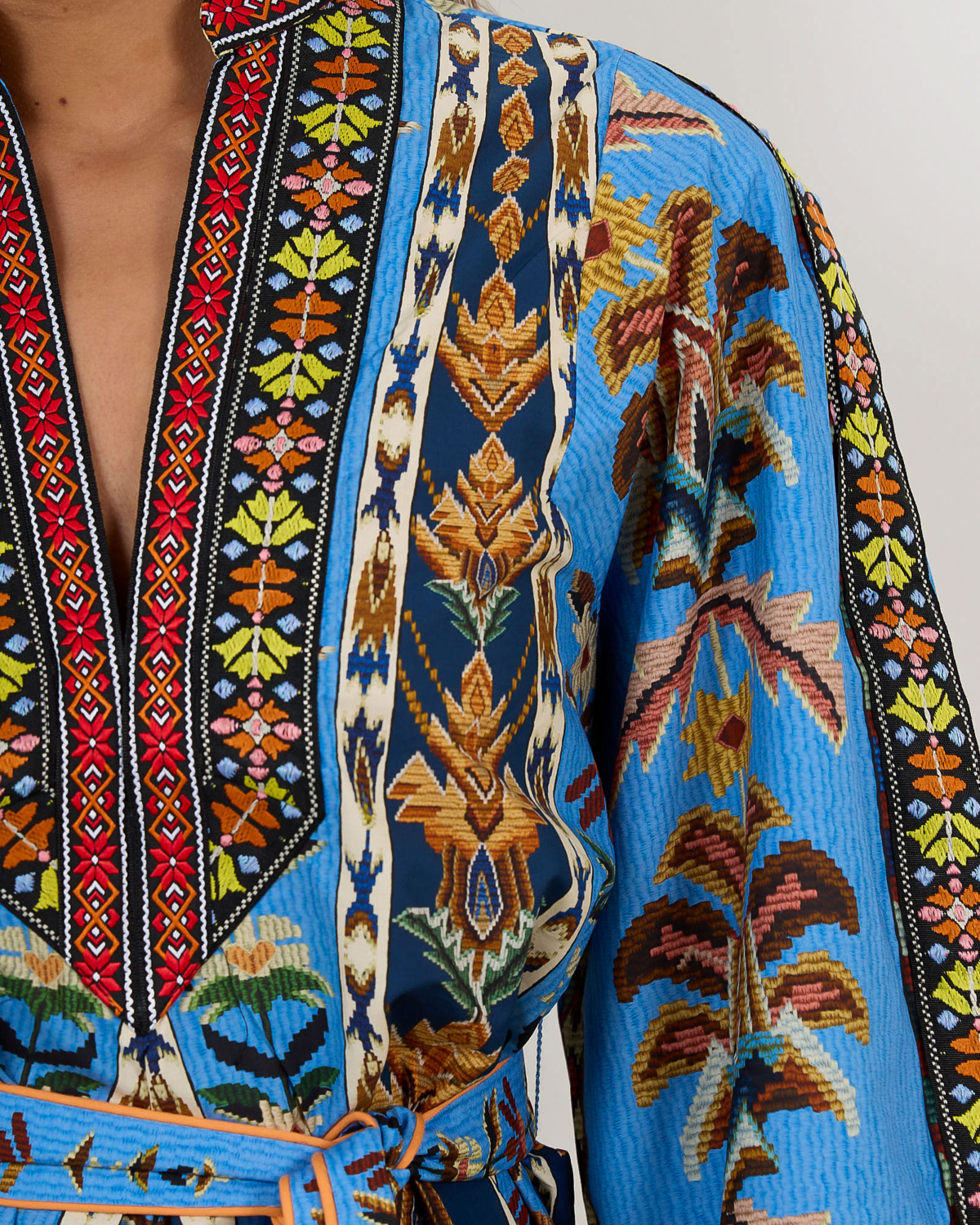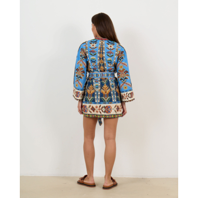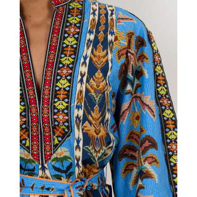 This striking women's clothing piece features an intricate embroidered pattern in vibrant blues, earth tones, and rich contrasting colors. The organic cotton construction offers breathable comfort with its regular fit silhouette. Long sleeves showcase elaborate tribal-inspired motifs, while the V-neckline is beautifully framed by ornate embroidered trim. A matching fabric belt cinches the waist for a flattering shape. Farm Rio delivers bold artisanal craftsmanship in this statement dress.