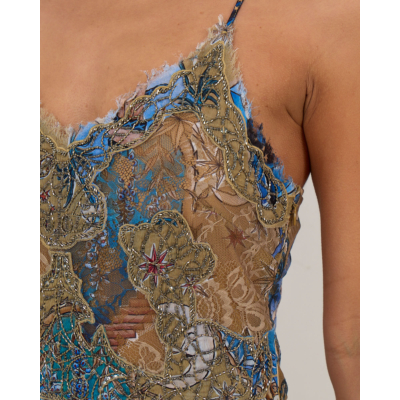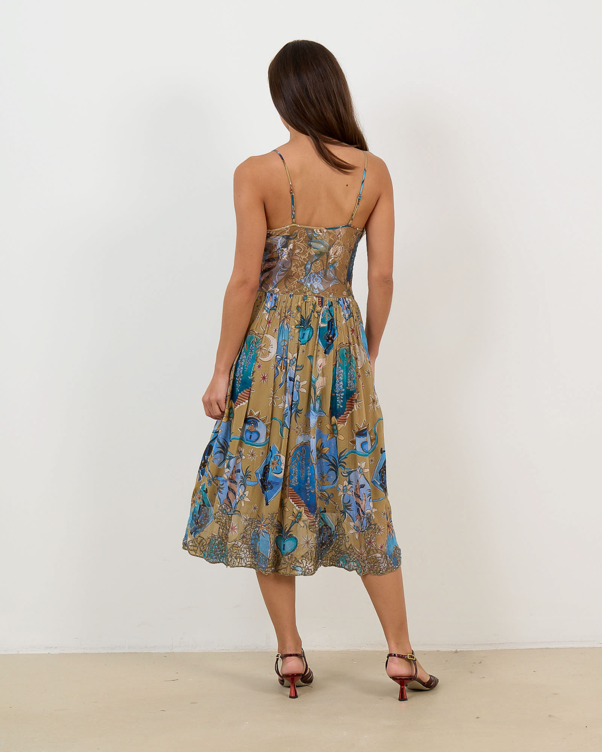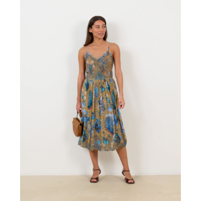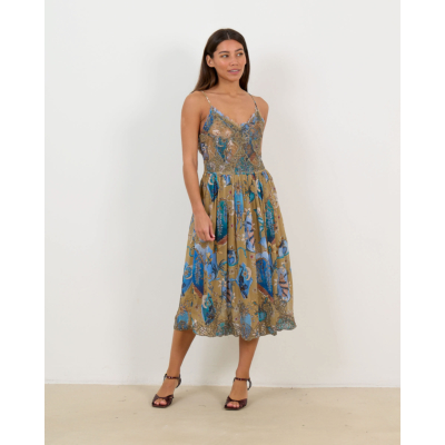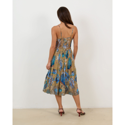 This captivating beige midi dress showcases intricate floral patterns in vibrant blue and gold tones. The 100% viscose fabric features delicate glitter stone embellishments that catch the light beautifully. Designed with thin adjustable straps and a flattering V-neckline, this Farm Rio creation offers a relaxed fit that flows gracefully to midi length. The ornate botanical print creates an enchanting visual story across the flowing silhouette.