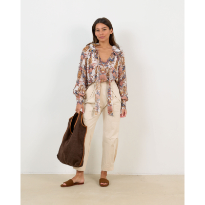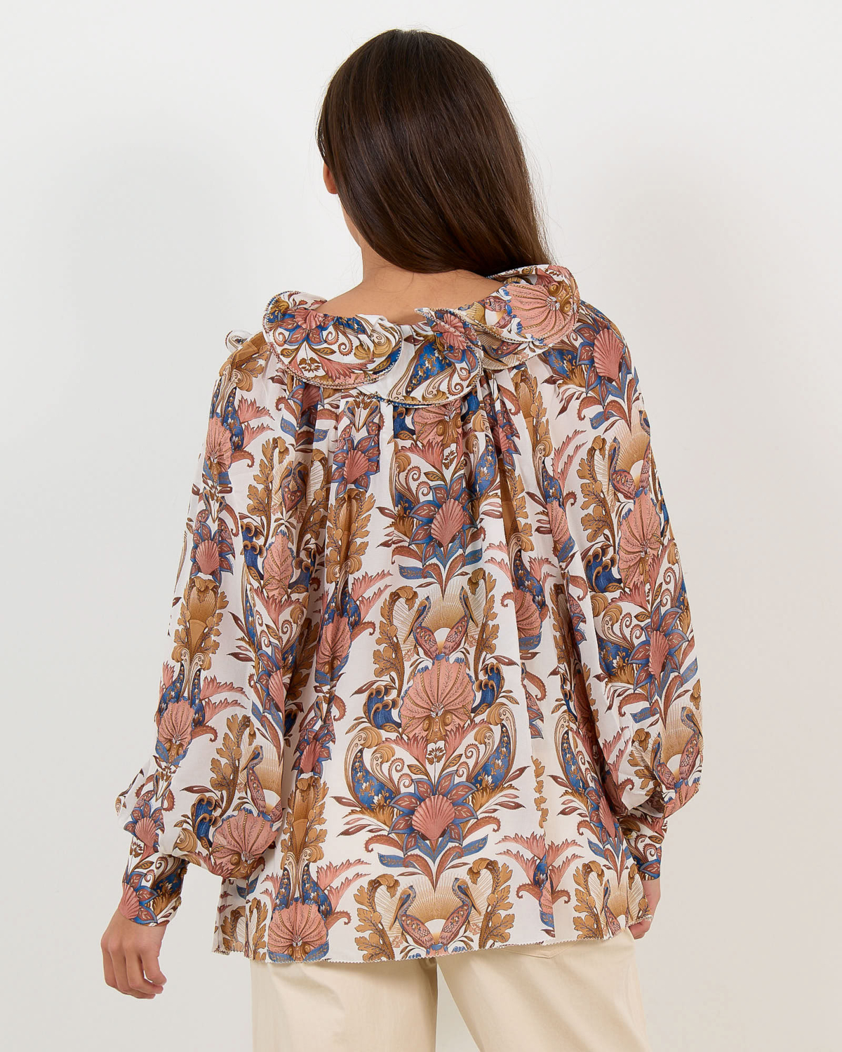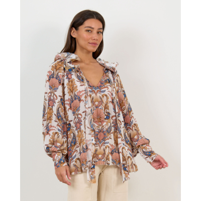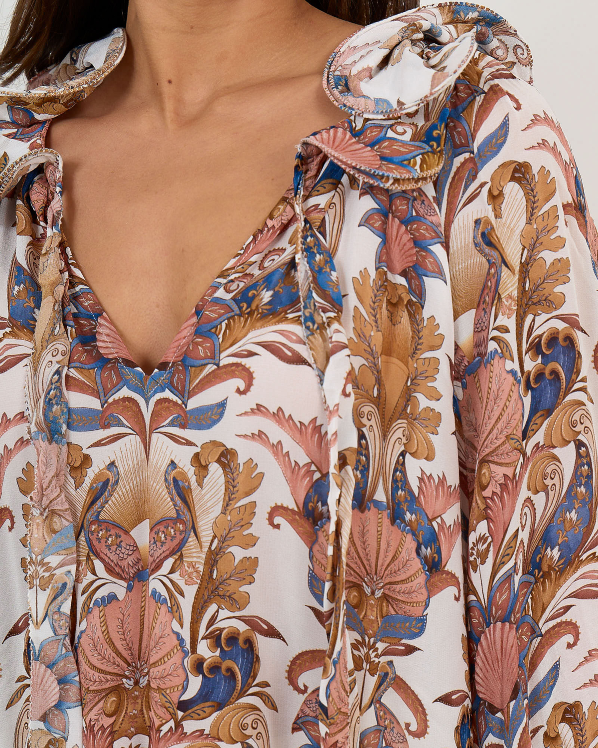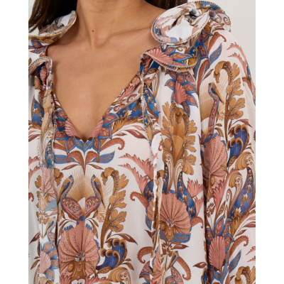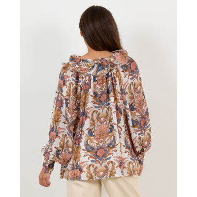 This elegant ruffled blouse showcases an intricate paisley pattern in warm earth tones against an off white base. The luxurious 100% viscose fabric flows beautifully with its relaxed fit silhouette. Long sleeves feature gathered cuffs while delicate ruffles frame the V-neckline. Decorative tie details at the collar add a refined finishing touch. The ornate botanical motifs create visual interest throughout this statement piece from Farm Rio.