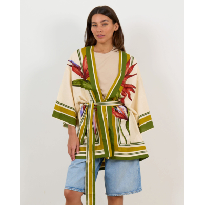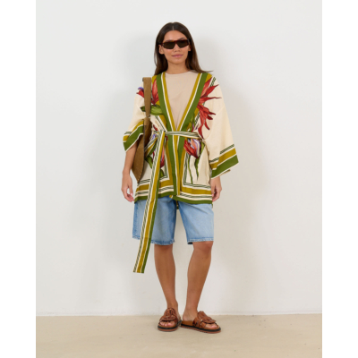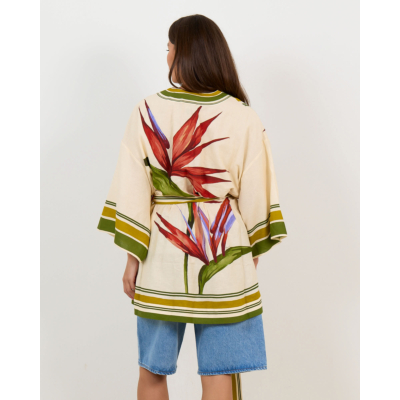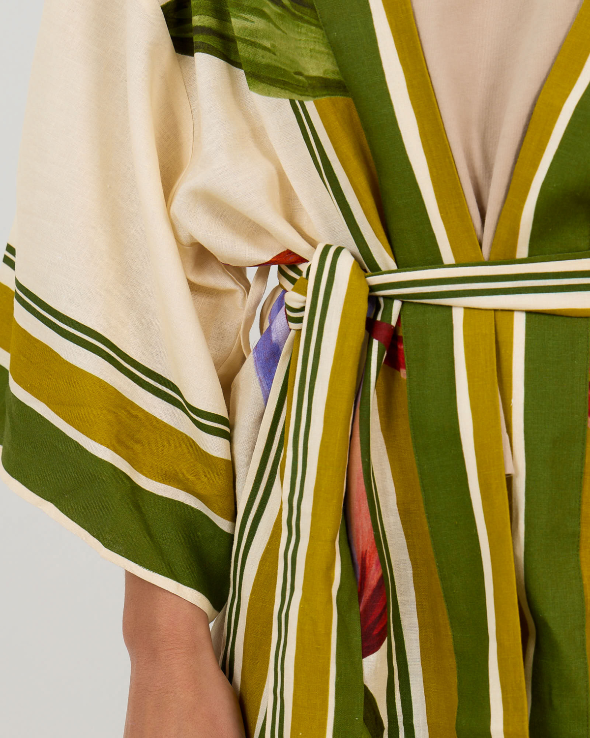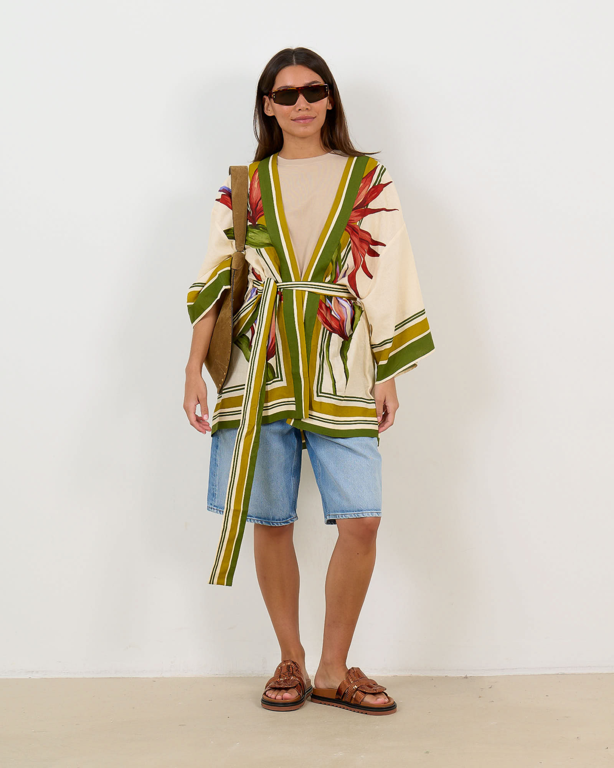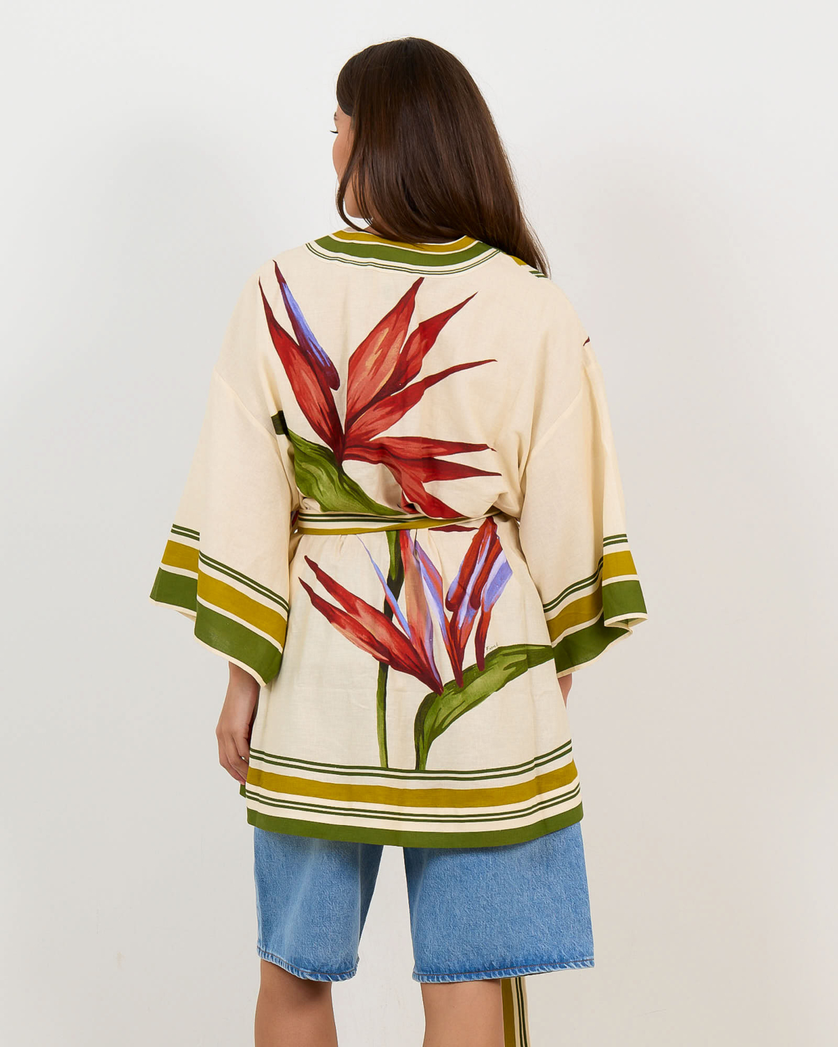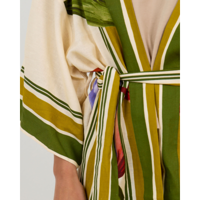 This vibrant pink kimono showcases an eye-catching tropical strelitzia print combined with bold striped detailing in green and yellow tones. The relaxed-fit silhouette features wide three-quarter sleeves and a deep V-neckline that ties at the waist with a matching belt. Crafted from a comfortable linen-viscose blend (55% linen, 45% viscose), this Farm Rio piece brings statement style to your women's clothing collection. The flowing design and luxurious fabric create an elegant drape that flatters every figure.
