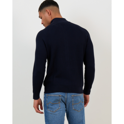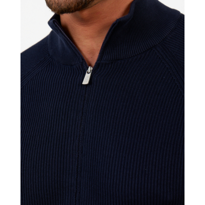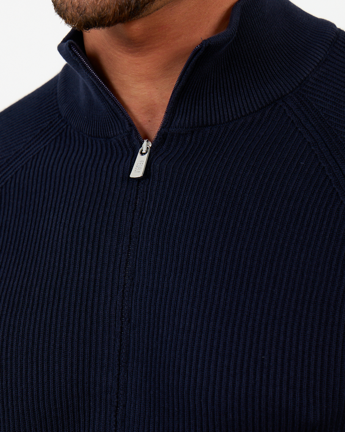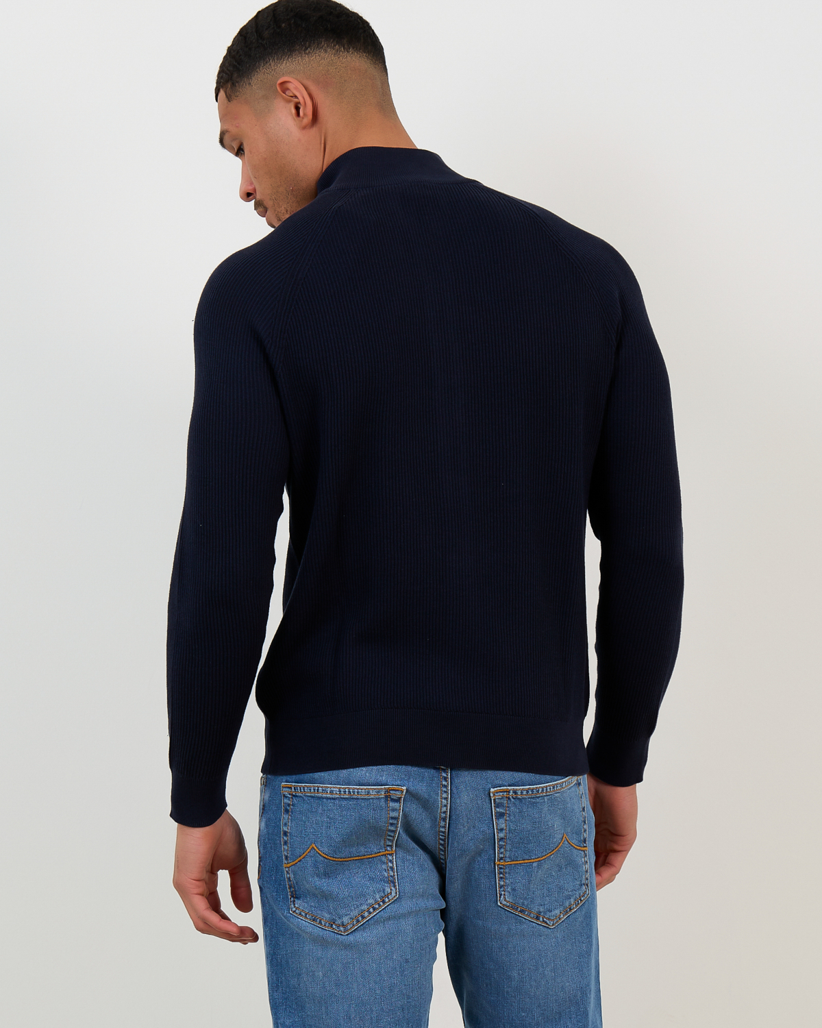 This navy knitwear piece from Fedeli showcases premium 100% cotton construction with distinctive ribbed texture throughout. The relaxed-fit silhouette features long sleeves and a practical quarter-zip closure with branded metal zipper pull. The rich navy tone provides versatility for both casual and refined men's clothing combinations.