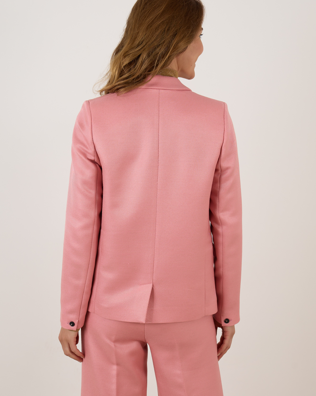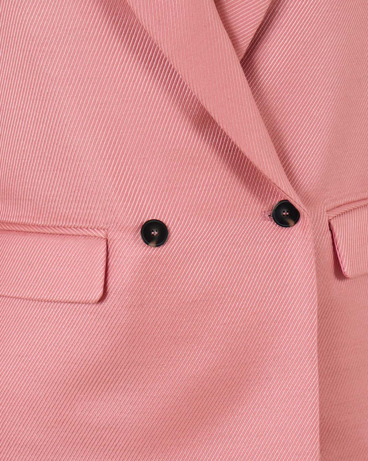 Double-breasted blazer van het merk Forte Forte in de kleur Rose. Deze stijlvolle blazer heeft een klassieke uitstraling met een moderne twist, dankzij de delicate roze tint. Voorzien van een enkele borstzak en twee praktische klepzakken, biedt deze blazer zowel functionaliteit als elegantie. Het splitje in het achterpand zorgt voor extra bewegingsvrijheid en een flatterende pasvorm. De blazer is volledig gevoerd, wat zorgt voor een luxueuze afwerking en draagcomfort.
