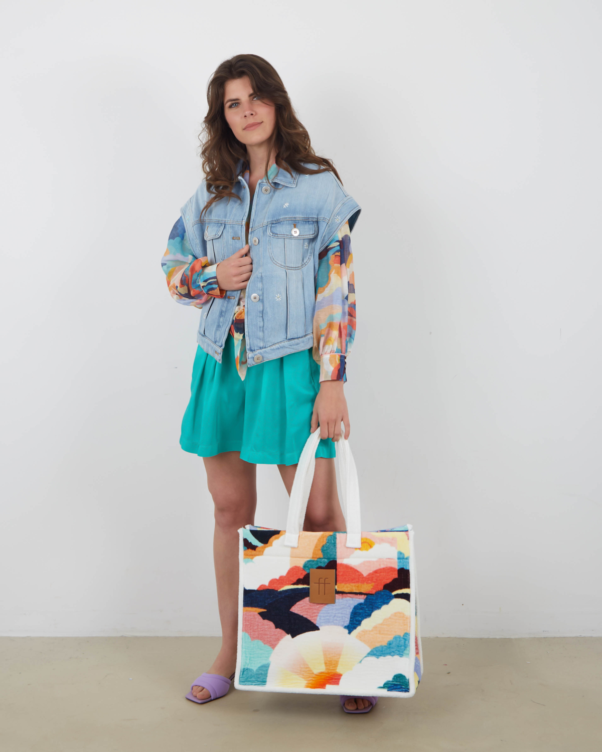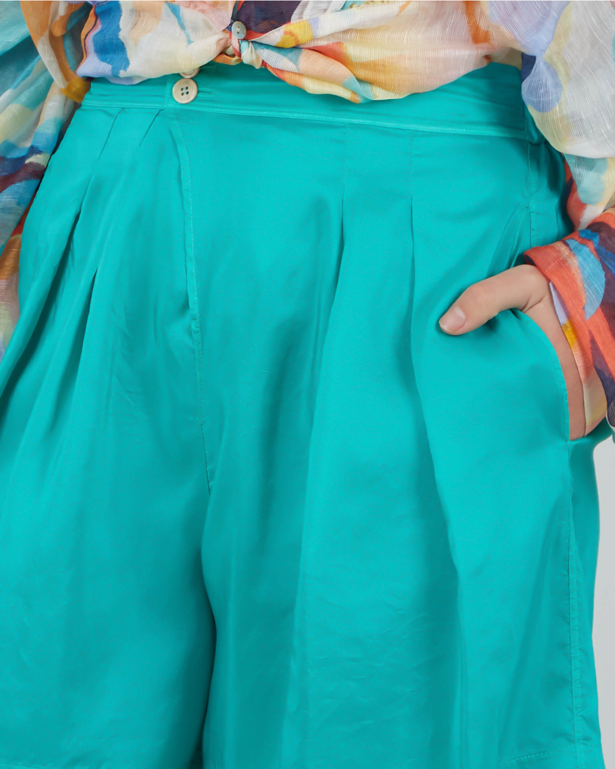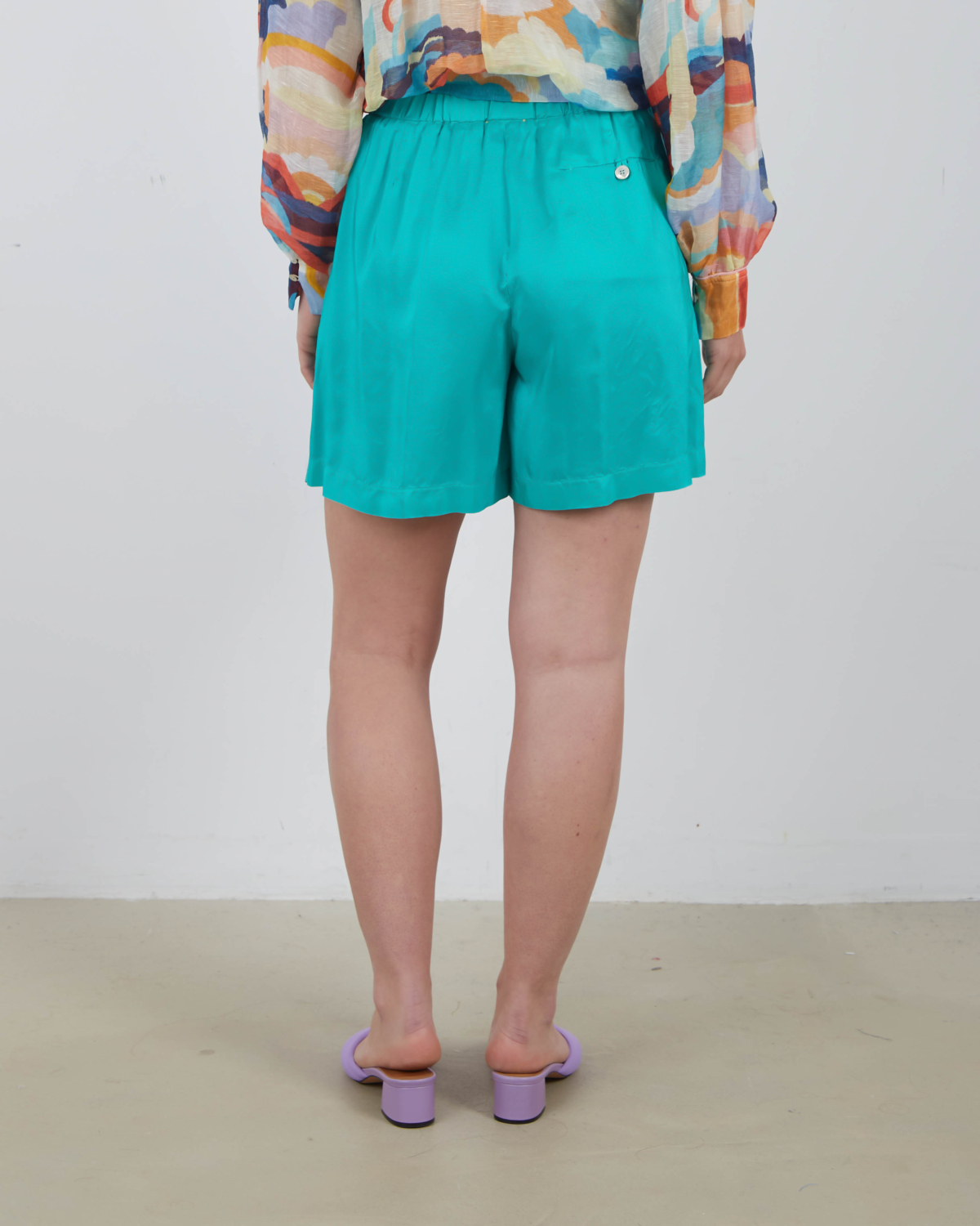 The Silk Habotay Shorts from Forte Forte come in the color Seafoam, a radiant and clear blue color, and have an energetic look thanks to the silk material. The loose-fitting shorts are decorated at the front with side pockets, pleats and an asymmetrical closure.