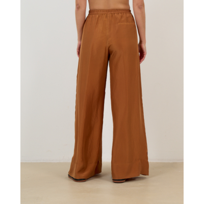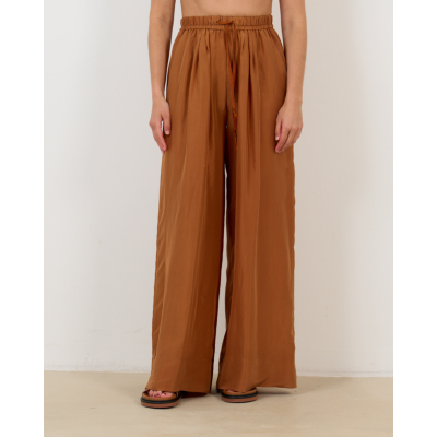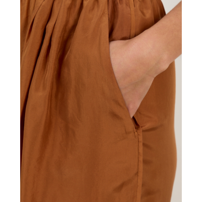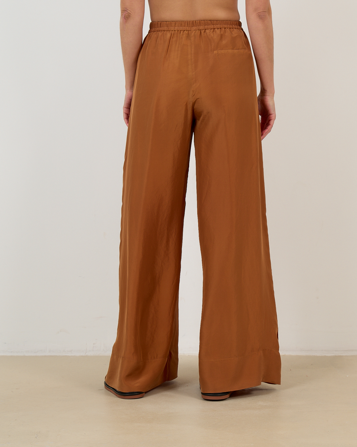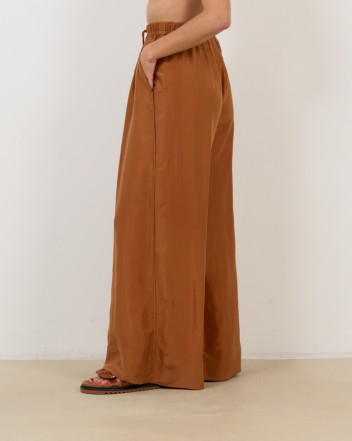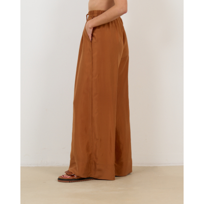 These luxurious silk trousers in rich rust capture the essence of refined women's clothing. The 100% silk fabric drapes beautifully, creating an elegant wide-leg silhouette that flows with every step. The elastic waistband features an adjustable drawstring tie for perfect comfort, while deep side pockets add practical functionality. The loose-fitting design ensures breathable comfort throughout the day. From Forte Forte, these statement trousers bring sophisticated luxury to your wardrobe. Style these silk trousers with a fitted blouse for polished elegance, or pair with a cropped sweater for contemporary sophistication.