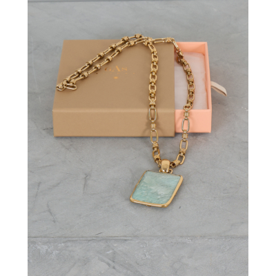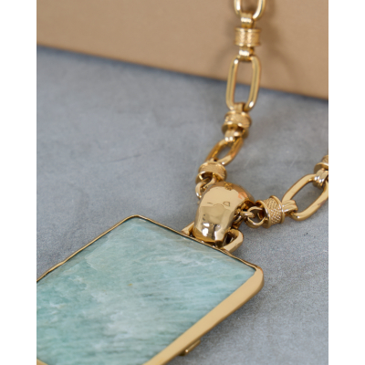 This striking gold long necklace features a sophisticated chain link design with a stunning rectangular amazonite stone pendant. The brass construction with fine gold plating creates a luxurious finish that catches the light beautifully. The chunky chain design alternates between oval and rectangular links, creating visual interest and contemporary appeal. The mint-green amazonite centerpiece is elegantly framed in gold, making this women's clothing accessory a true statement piece. From Francoise, this necklace combines modern design with timeless elegance.
