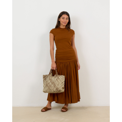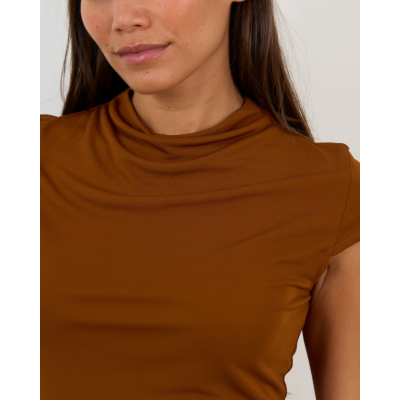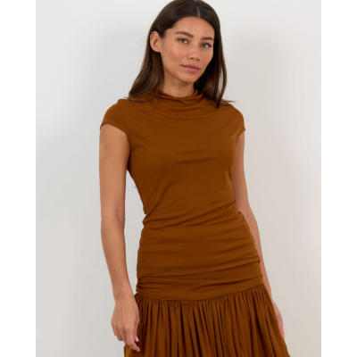 This sophisticated brown top showcases modern women's clothing at its finest. Crafted from 100% viscose jersey with stretch, the Nora features an elegant high neckline and short sleeves that create a refined silhouette. The walnut brown shade adds warmth to your look, while the fitted design flows into a gathered hem detail for an unexpected twist. Francoise delivers quality construction with this versatile piece that transitions beautifully from day to evening wear.