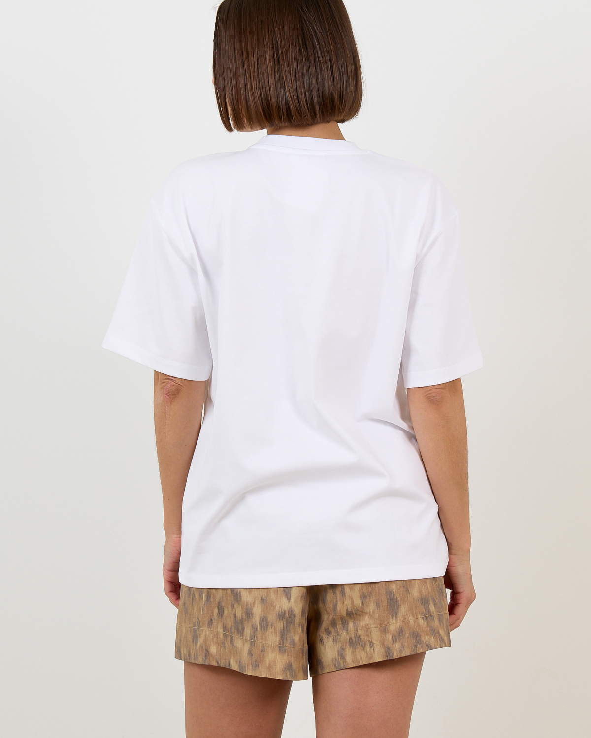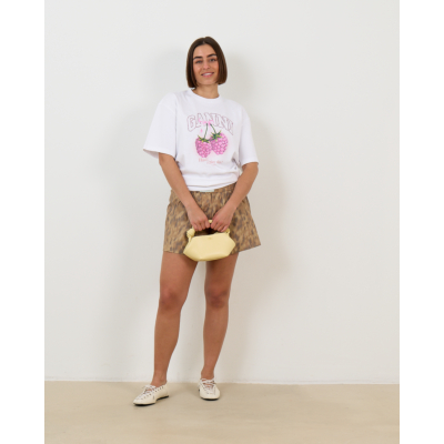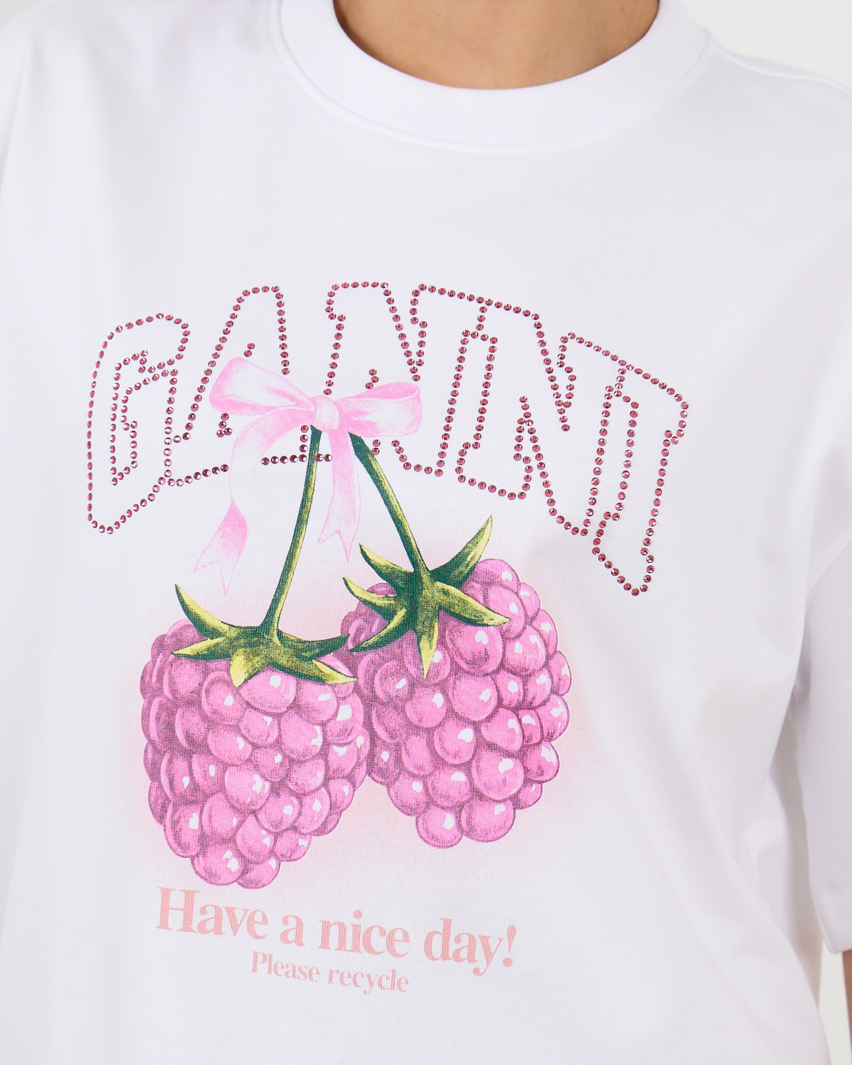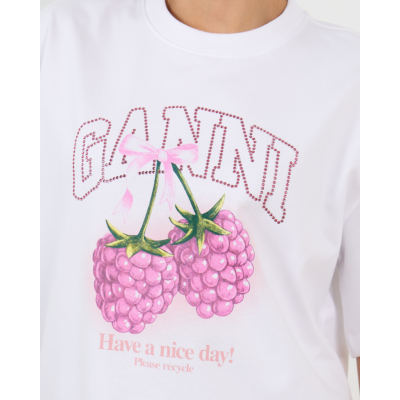 This white organic cotton t-shirt from Ganni features a playful rhinestone "GANNI" logo paired with vibrant raspberry graphics. The short sleeves and crew neck create a relaxed silhouette, while the 100% cotton construction ensures breathable comfort. The regular fit provides a contemporary look that works for various occasions. The rhinestone detailing adds sparkle to the fruit motif, making this women's clothing piece both fun and sophisticated.