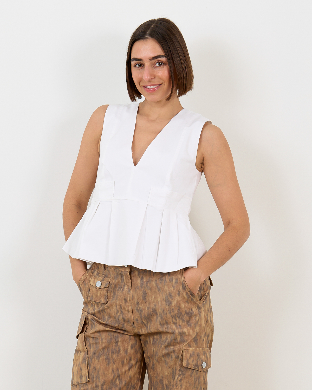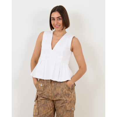 This white sleeveless peplum top features a flattering V-neckline and defined waist silhouette. The regular fit design showcases a flared hemline that creates an elegant feminine shape. Crafted from 97% organic cotton with 3% elastane, this women's clothing piece offers comfortable stretch and breathability. The sleeveless construction and back zipper closure complete the refined aesthetic. Created by Ganni, this versatile top transitions beautifully from day to evening wear.