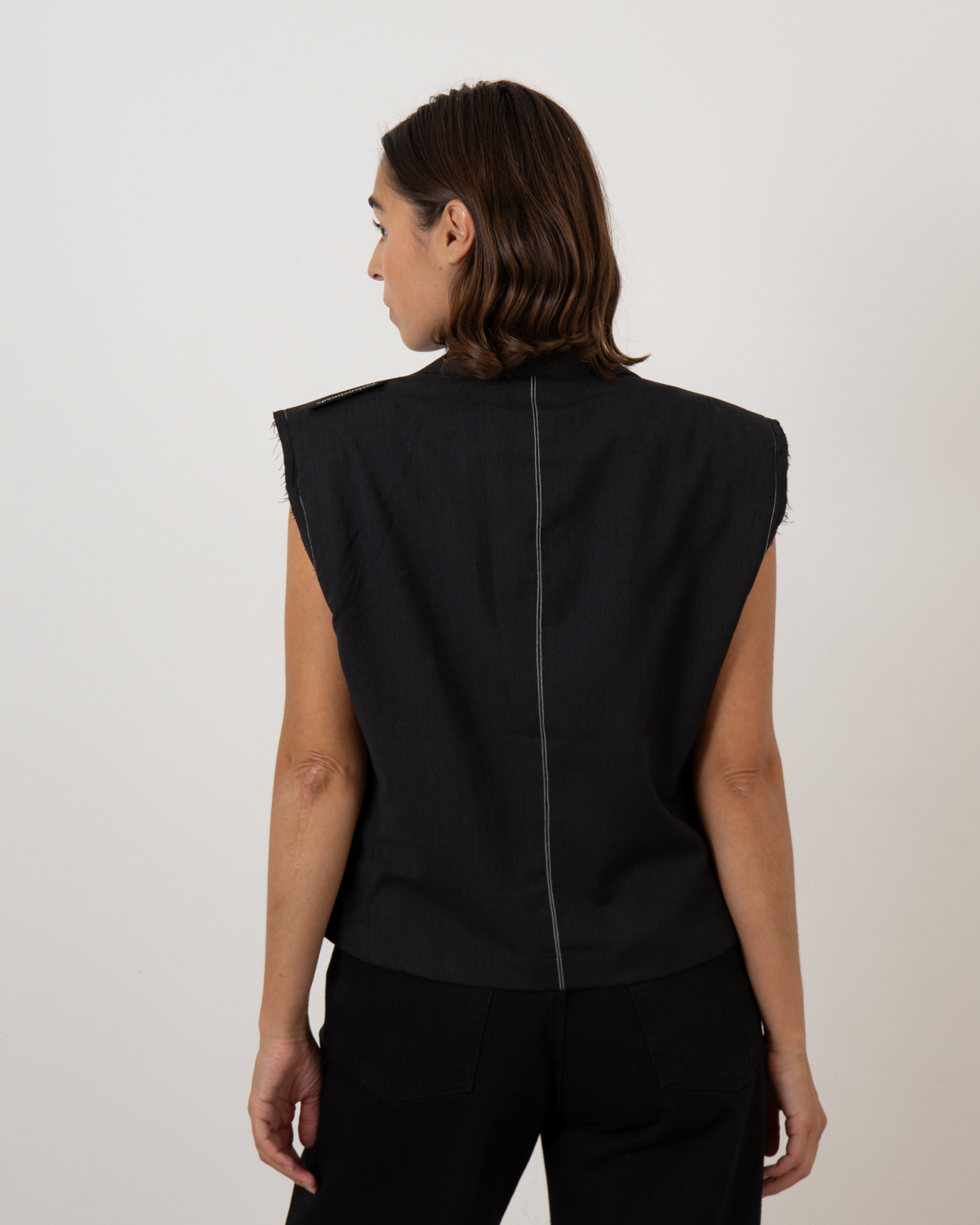 This striking black vest brings contemporary edge to women's clothing with its sleeveless silhouette and structured design. The piece features a classic lapel collar and double-breasted button closure with two black buttons for refined detailing. Crafted from an 80% polyester and 20% cotton blend, this vest offers both comfort and durability. The regular fit provides a flattering shape, while contrasting white topstitching adds modern appeal to the edges and seams. From 1/OFF, this versatile piece elevates any outfit with its tailored construction.