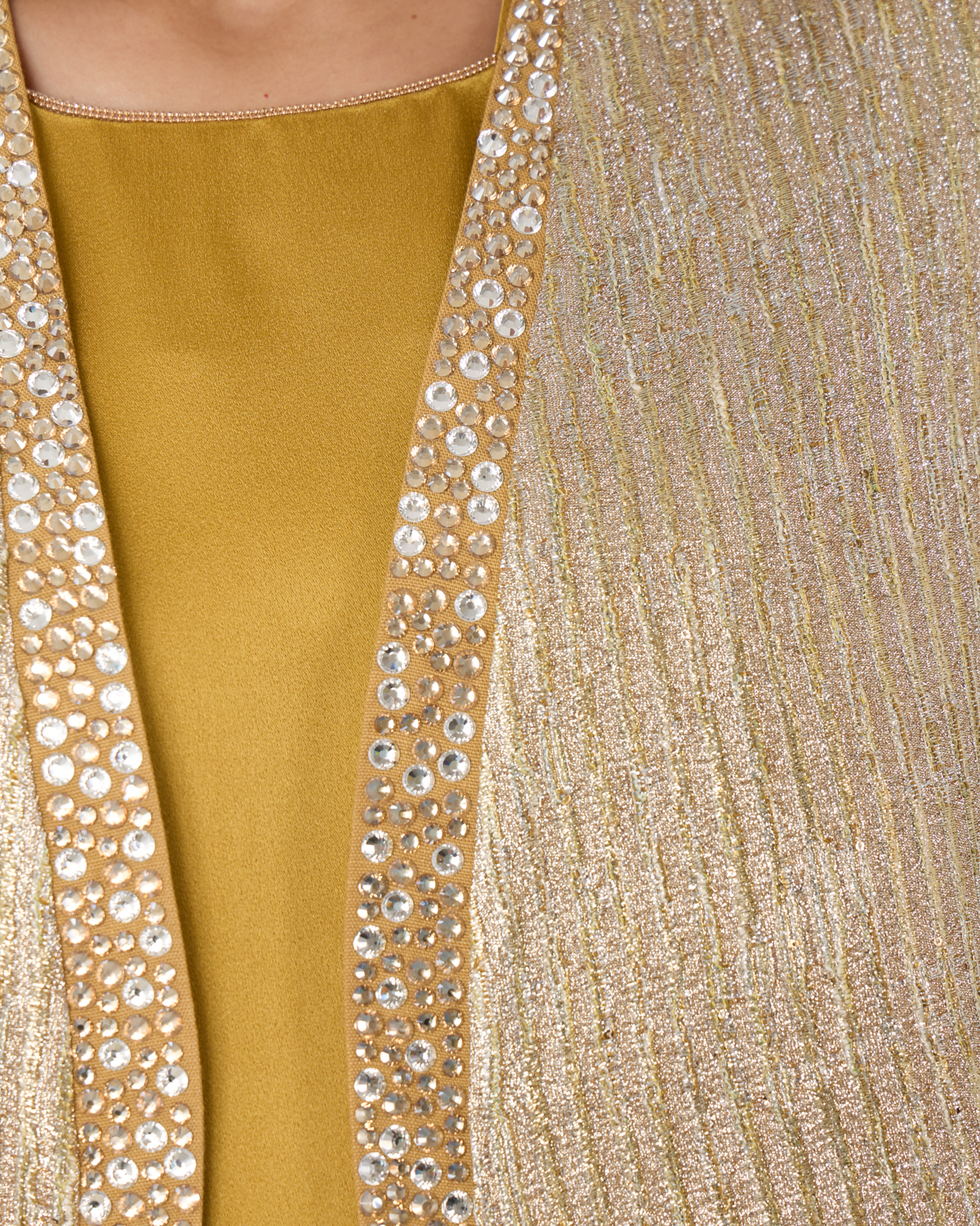 Dit cropped gilet van forte_forte straalt pure elegantie uit. De subtiele glans van de goudkleurige stof wordt versterkt door verfijnde diamanten steentjes langs de halslijn, die een vleugje glamour toevoegen. Met zijn vrouwelijke silhouet en chique details is dit gilet een echte eyecatcher – perfect voor feestelijke gelegenheden of om een statement te maken in je dagelijkse look.