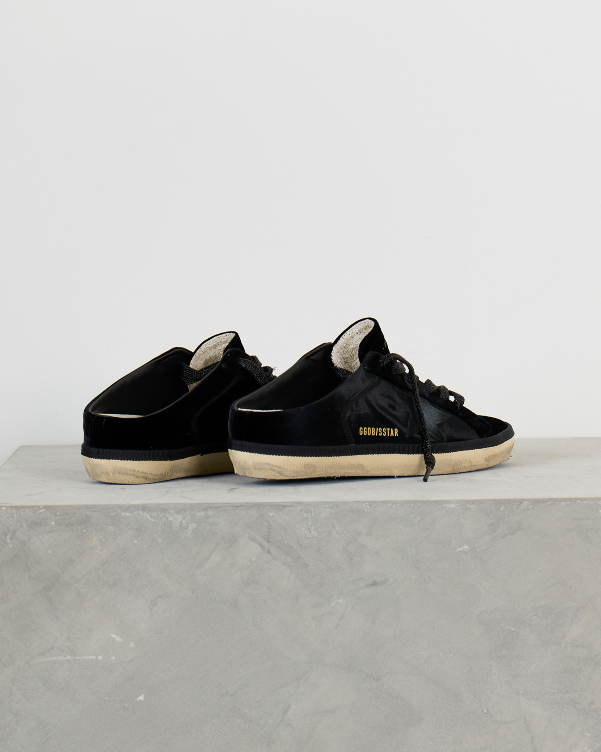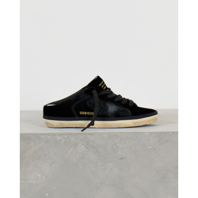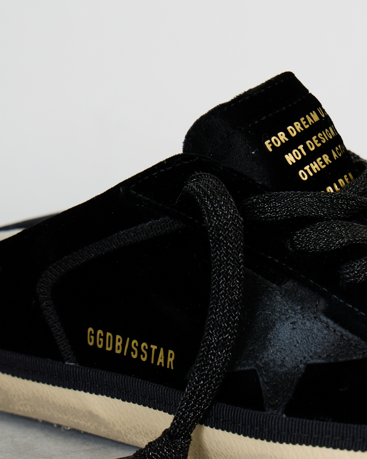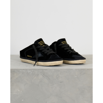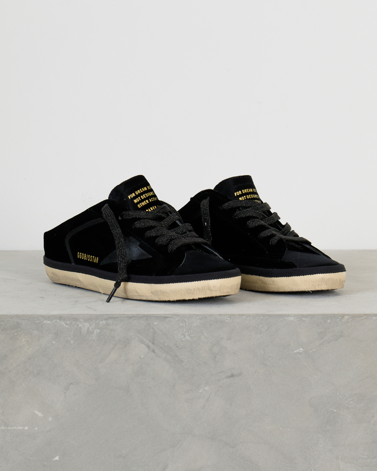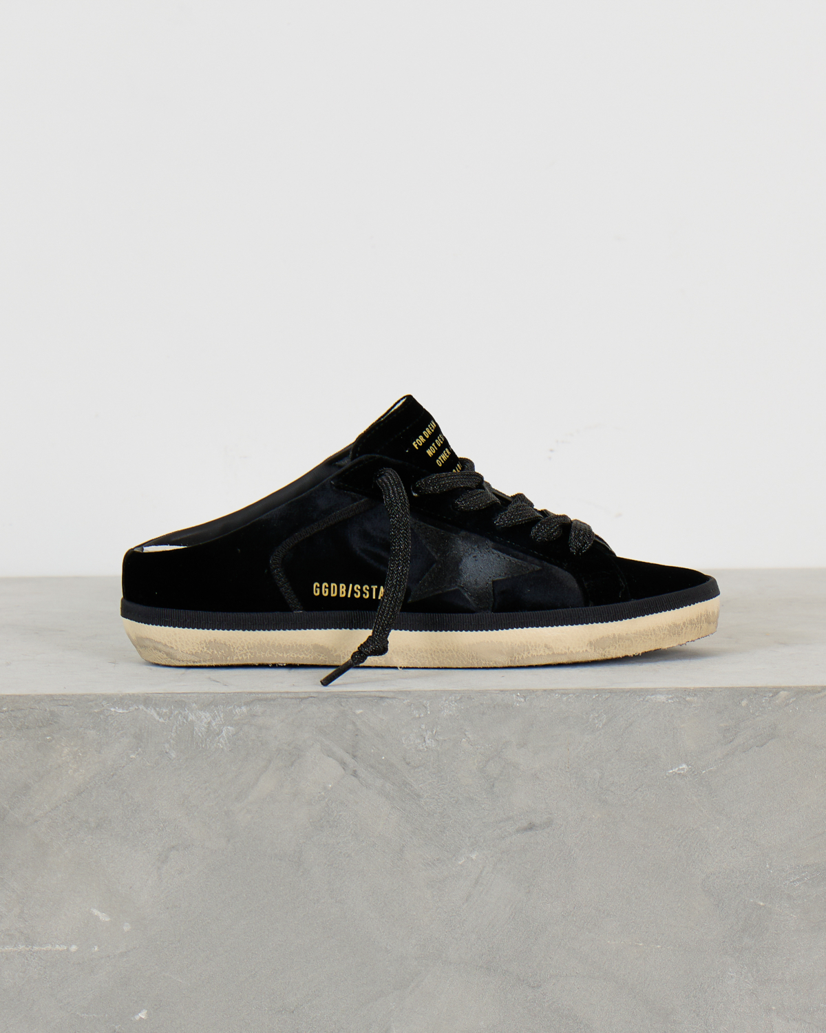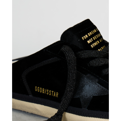 These striking black slide sneakers combine luxurious velvet with smooth leather details for a sophisticated take on women's clothing. The iconic star motif creates a bold contrast against the rich black velvet upper, while the leather accents add refined texture. Traditional lace-up styling meets modern slide functionality, featuring the signature GGDB/SSTAR branding and inspirational text detailing. The cream-colored rubber sole provides a vintage-inspired finish that perfectly balances the contemporary black design.
