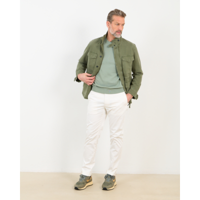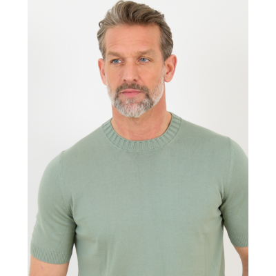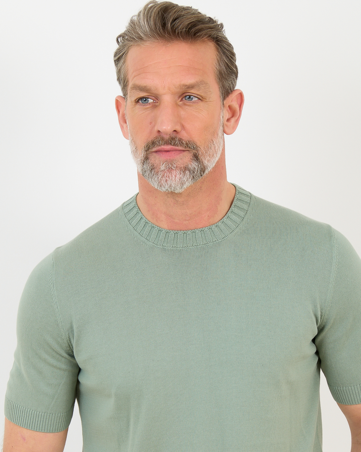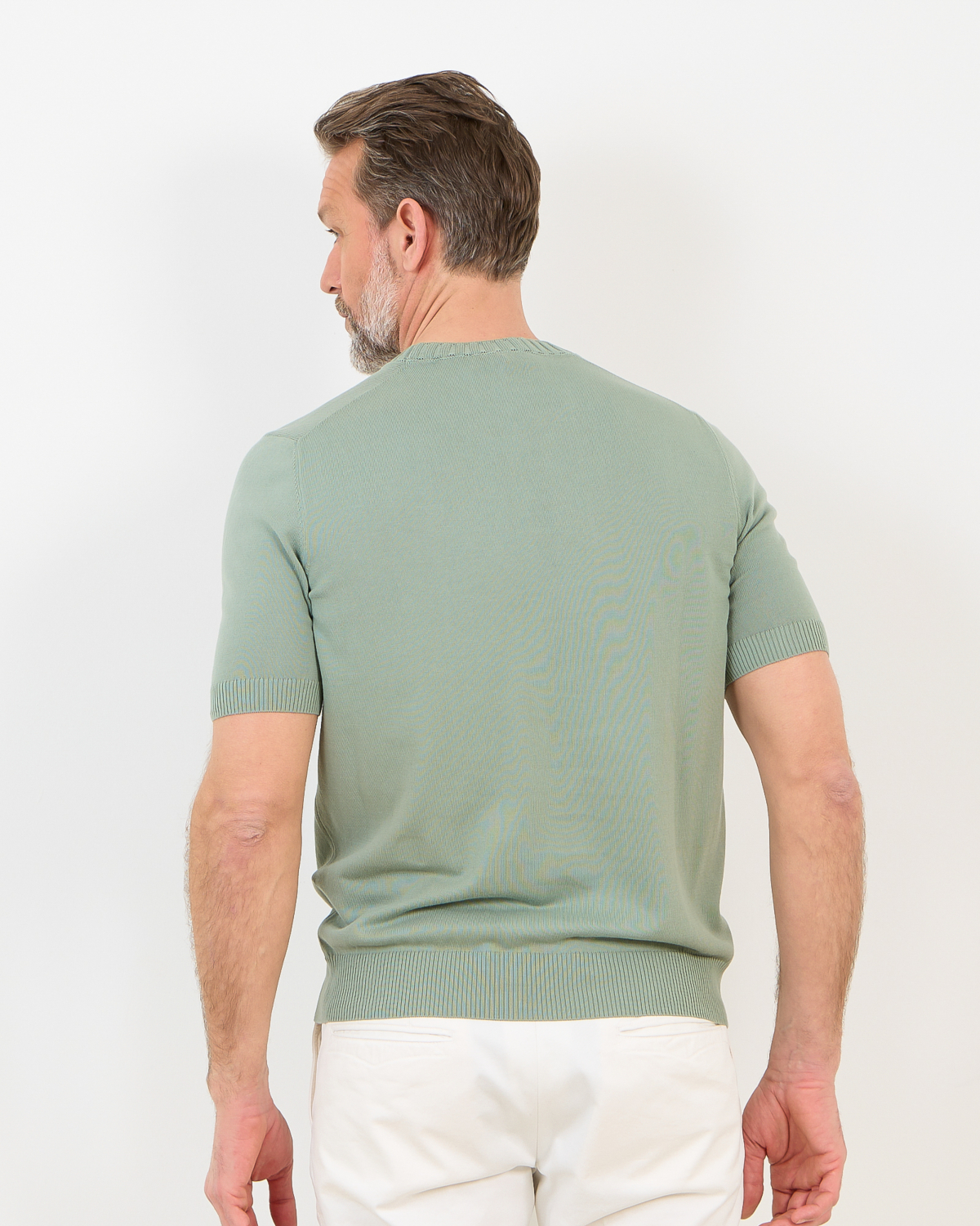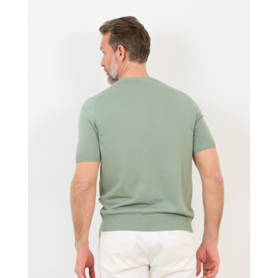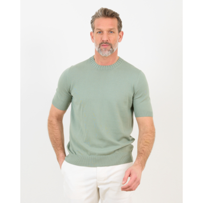 This sage green short-sleeved pullover combines refined Italian craftsmanship with contemporary men's clothing design. Crafted from 100% cotton by Gran Sasso, the knit offers natural breathability and comfort. The regular fit silhouette features a classic crew neck with ribbed detailing that extends through the sleeves and hem. Short sleeves make this piece perfect for transitional seasons.