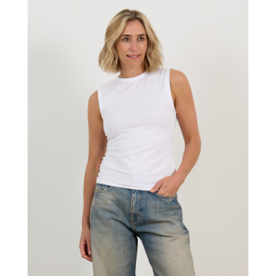 This crisp white sleeveless tank creates a fresh foundation for your women's clothing collection. The round neckline and fitted silhouette showcase the quality cotton blend construction of 95% cotton and 5% elastane. This Herman piece features a sleek fitted cut that hugs your curves naturally. The soft white fabric offers breathable comfort while maintaining its structured shape throughout the day.