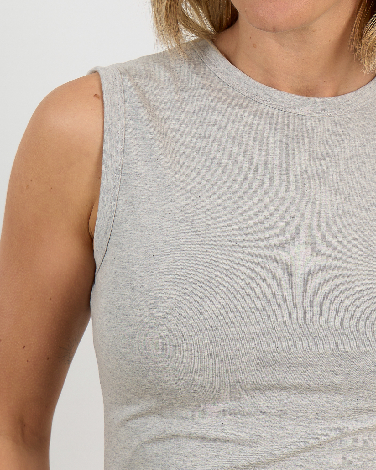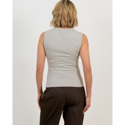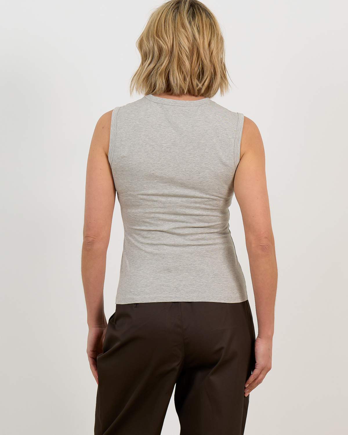 This sleeveless fitted tank top in light grey embodies modern sophistication for your women's clothing collection. The sleek crew neckline and slim fit silhouette create a refined foundation piece that enhances your natural shape. Crafted from a premium cotton blend of 95% cotton and 5% elastane, this piece offers exceptional comfort with gentle stretch that moves with you. The sleeveless design and smooth finish make it perfect for layering or wearing solo. From Herman, this versatile tank elevates any ensemble with its clean lines and quality construction.