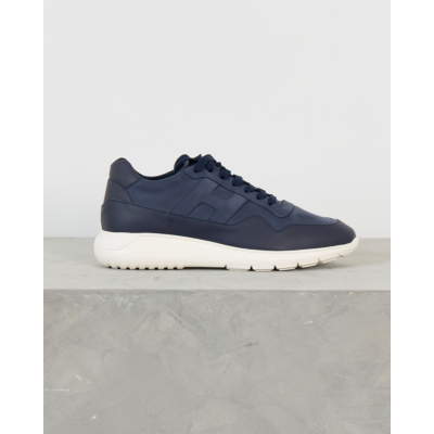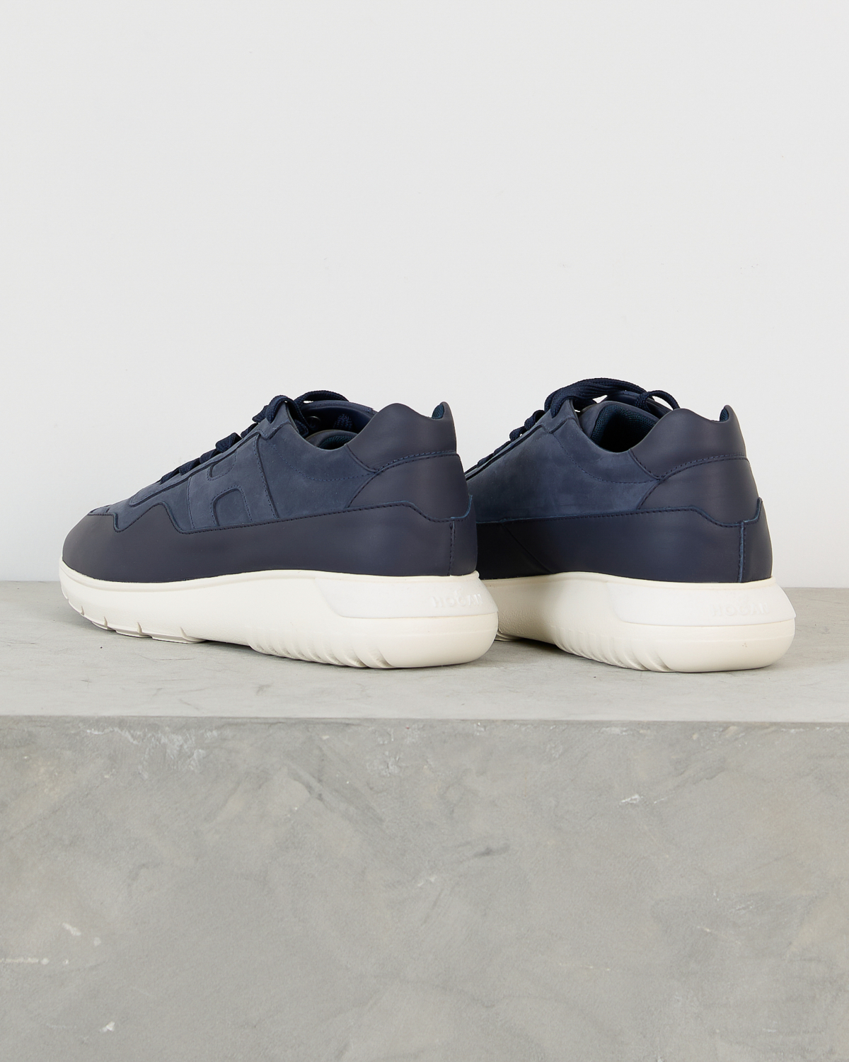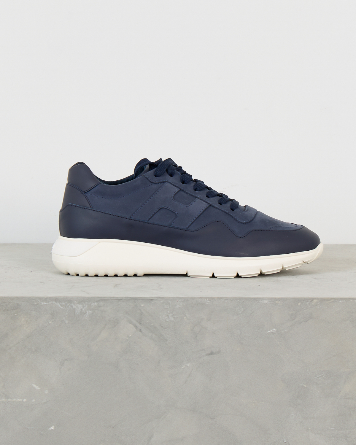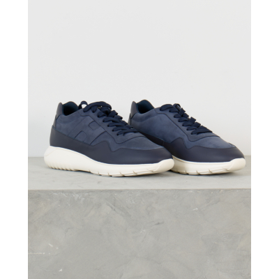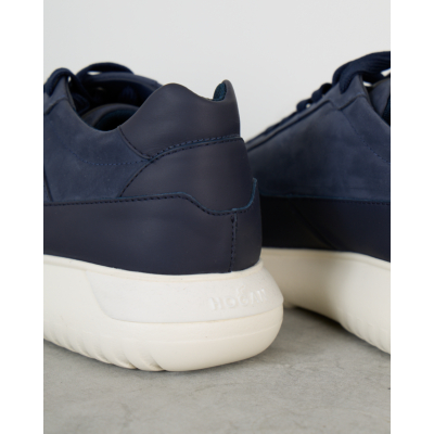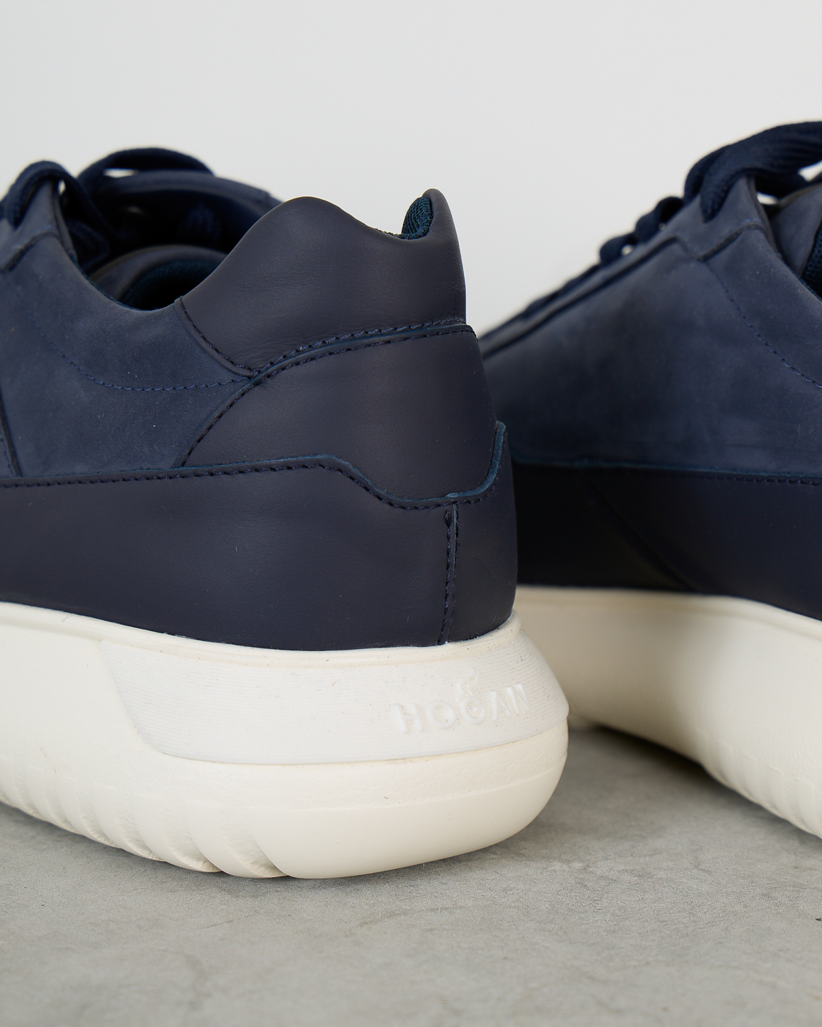 These sophisticated navy blue sneakers from Hogan showcase premium suede construction with refined tonal stitching details. The Hyperlight design features a classic lace-up closure and the distinctive H logo subtly integrated into the side panels. The contrast white sole provides modern athletic comfort while maintaining an elevated aesthetic. The rich navy suede upper offers texture and depth, complemented by tonal heel detailing.