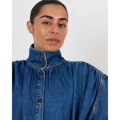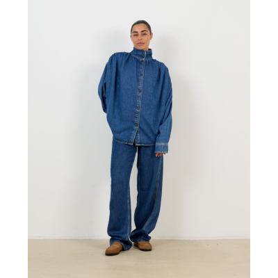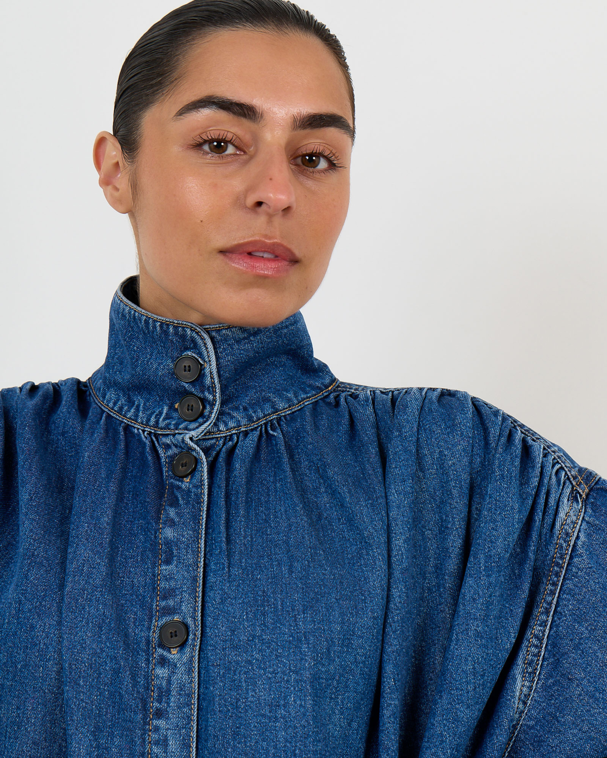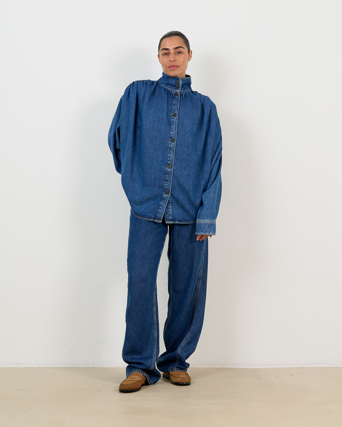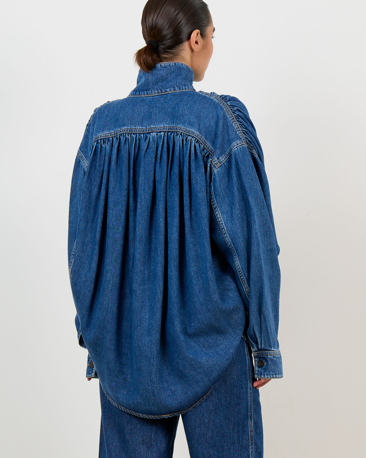 This striking denim blouse in rich blue showcases Iro's contemporary approach to women's clothing. Crafted from 100% Tencel, the oversized fit creates a modern silhouette with long sleeves and dramatic gathered detailing at the high neckline. The full button-front closure features distinctive dark buttons, while gathered fabric flows elegantly from the yoke across the back. The fluid draping and premium Tencel fabric ensure both comfort and sophisticated style.