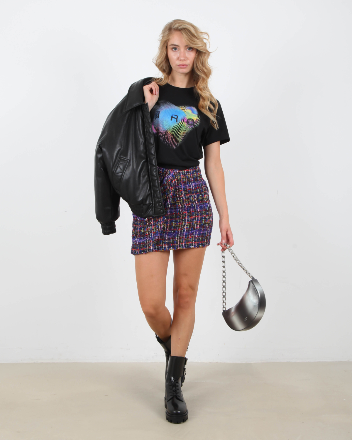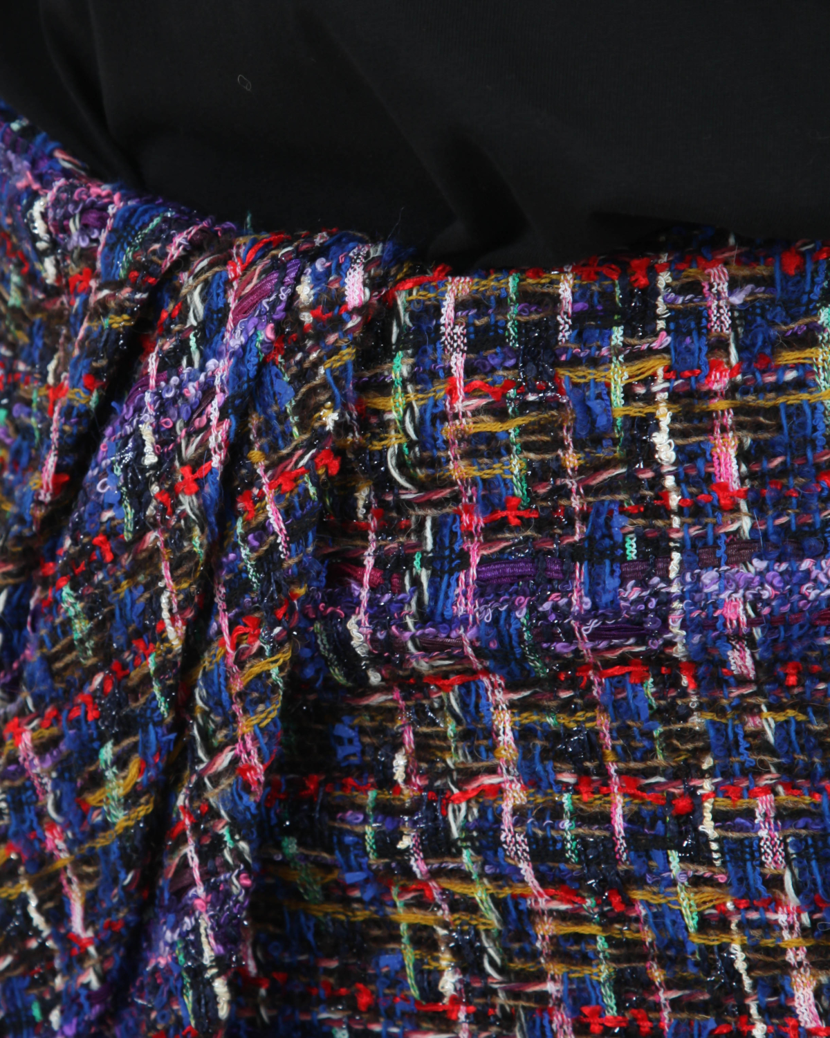 The Wakiza Skirt by Iro has a straight silhouette with a closed wrap over at the front. The skirt is made of tweed fabric and is given an elegant accent by the silver-colored thread that is processed between all the colors. At the center back is a concealed zipper and the skirt is lined.