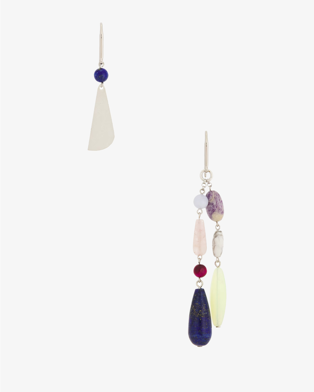 These striking asymmetrical earrings showcase Isabel Marant's contemporary approach to women's clothing accessories. Crafted from 70% brass and 30% stone, each earring features a unique composition of natural stones in silver, blue, pink, purple and green tones. The left earring displays a minimalist design with a single blue stone and silver teardrop pendant, while the right creates dramatic length with multiple cascading stone elements. Hook closures ensure comfortable wear throughout the day.