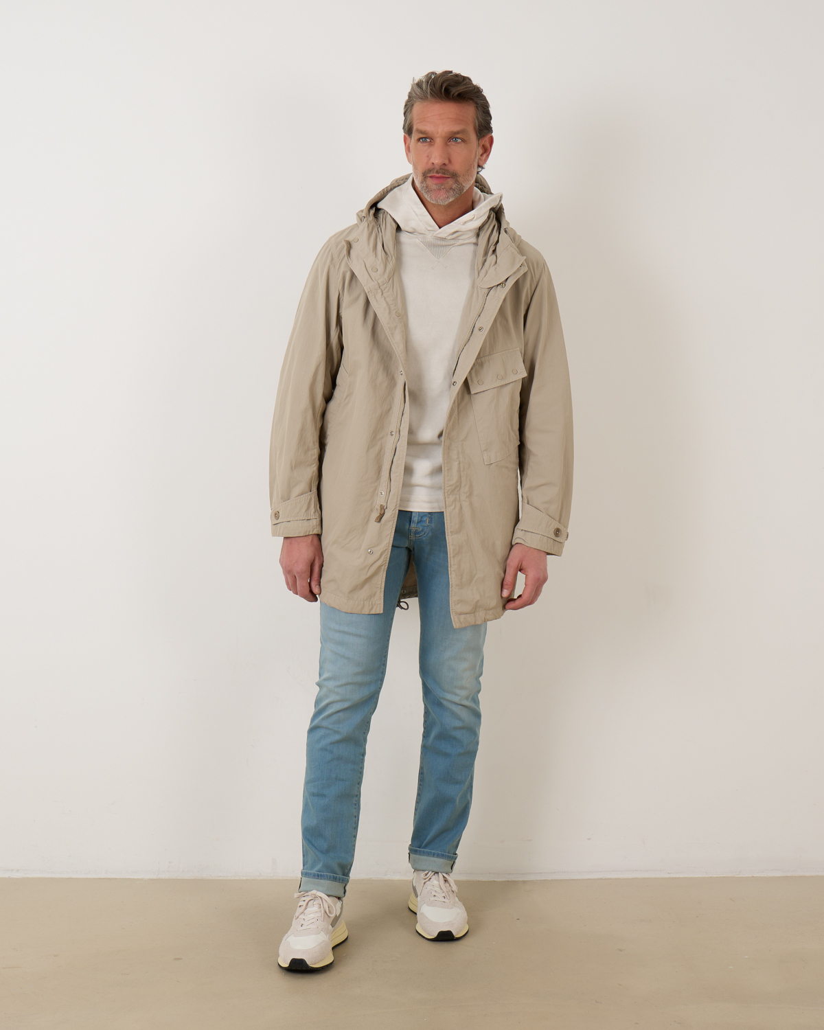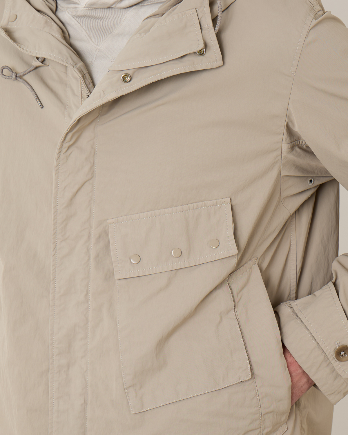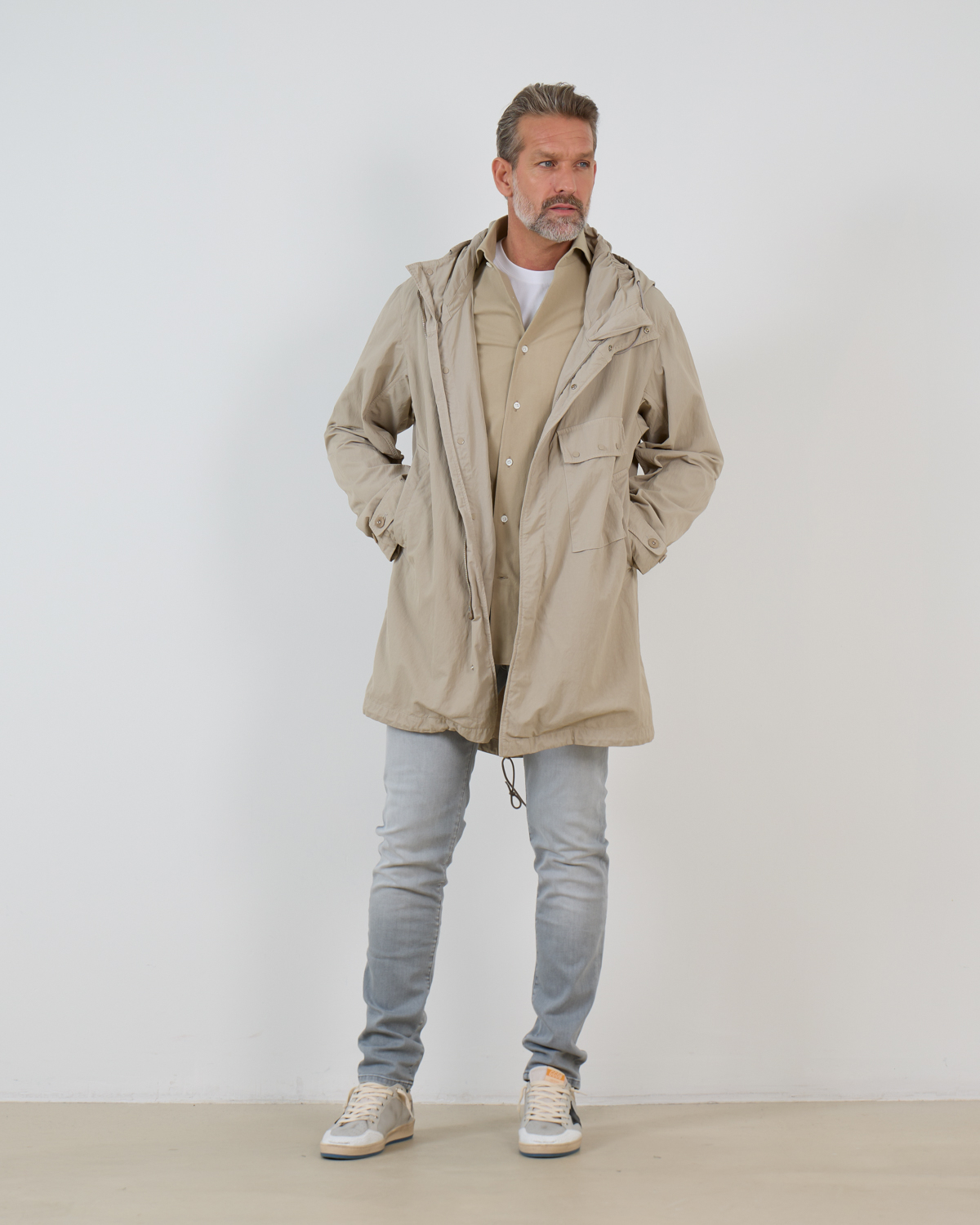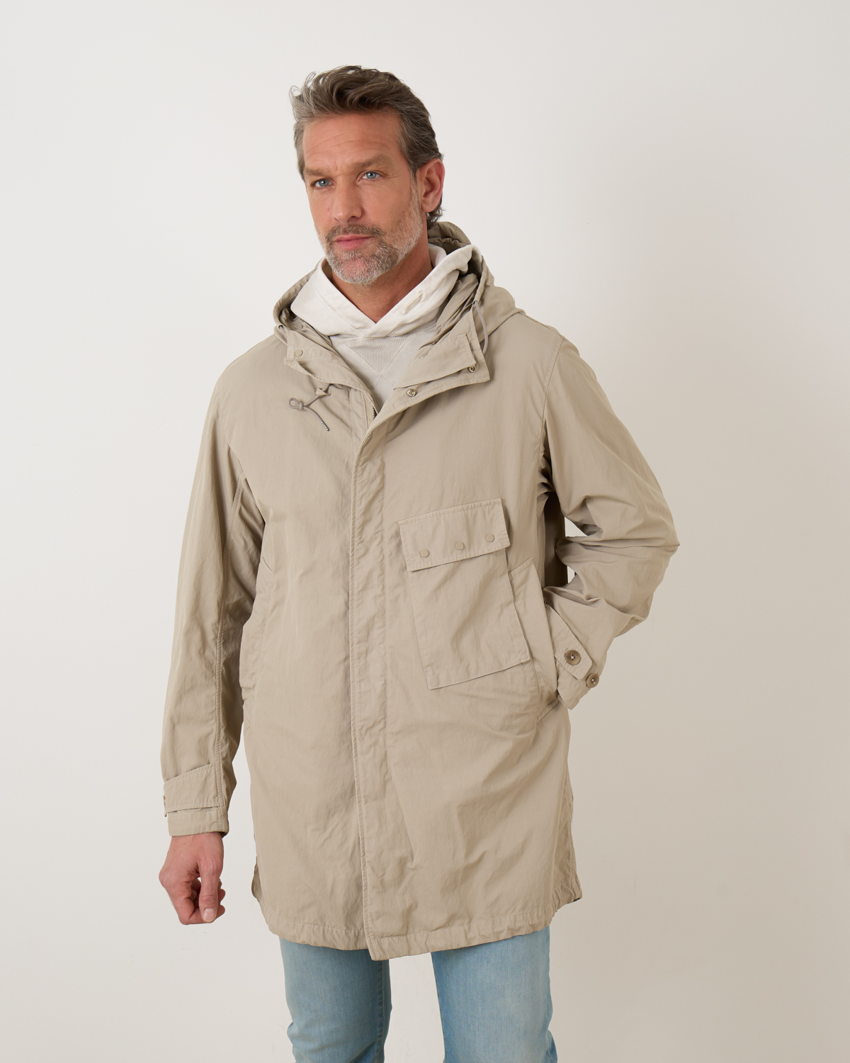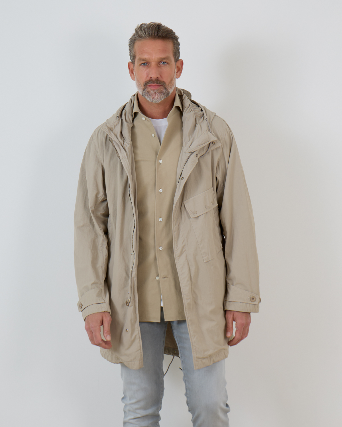 De Cyclone Parka van Ten-C komt in de kleur taupe en is gemaakt van technisch materiaal uit Japan. Deze materialen zijn gekookt en gewaxt om een sterke robuuste buitenlaag te krijgen die beschermt is tegen buitenelementen. De halflange parka met capuchon heeft een gecombineerde knoop- en ritssluiting en verschillende praktische zakken. Aan de achterkant is de parka voorzien van een gesplitse zoom. Combineer de parka met een Ten-C down liner voor extra warmte.